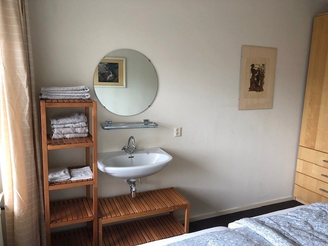 Deze 2e slaapkaner van ca 12M2 heeft stucwerk wanden en plafond. Ook is er een extra wastafel met spiegel aanwezig. Deze slaapkamer heeft ook vloerbedekking.