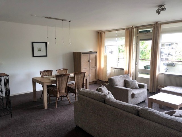 Een ruime woonkamer met veel natuurlijk lichtinval door de grote raampartijen. Een zitgedeelte aan de balkonzijde en een centraal gelegen eetgedeelte. Als afwerking strakke stucwerk wanden, spuitwerk plafond en vloerbedekking. De woonkamer heeft airconditioning. Een vernieuwd zijraam zorgt voor extra lichtinval en uitzicht over Eindhoven en omgeving. Vanuit de woonkamer is er toegang naar het dakterras (oosten) aan de voorzijde (ca. 25 m²), gesitueerd over de volledige breedte van de woonkamer en op de hoek gesitueerd. waardoor u een prachtig uitzicht heeft. Op deze heerlijke plek kunt u genieten van de ochtendzon en heeft u een indrukwekkend uitzicht over de stad. Een over de volle breedte aanwezige elektrische zonneluifel zorgt voor aangename schaduw in de zon.