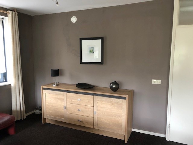 A spacious living room with lots of natural light through the large windows. A sitting area on the balcony side and a centrally located dining area. As a finish, sleek stucco walls, spray ceiling and floor covering. The living room has air conditioning. A renewed side window provides extra light and a view of Eindhoven and the surrounding area. From the living room there is access to the roof terrace (east) at the front (approx. 25 m²), situated over the full width of the living room and located on the corner. giving you a beautiful view. In this wonderful place you can enjoy the morning sun and have an impressive view of the city. An electric awning over the full width provides pleasant shade in the sun.