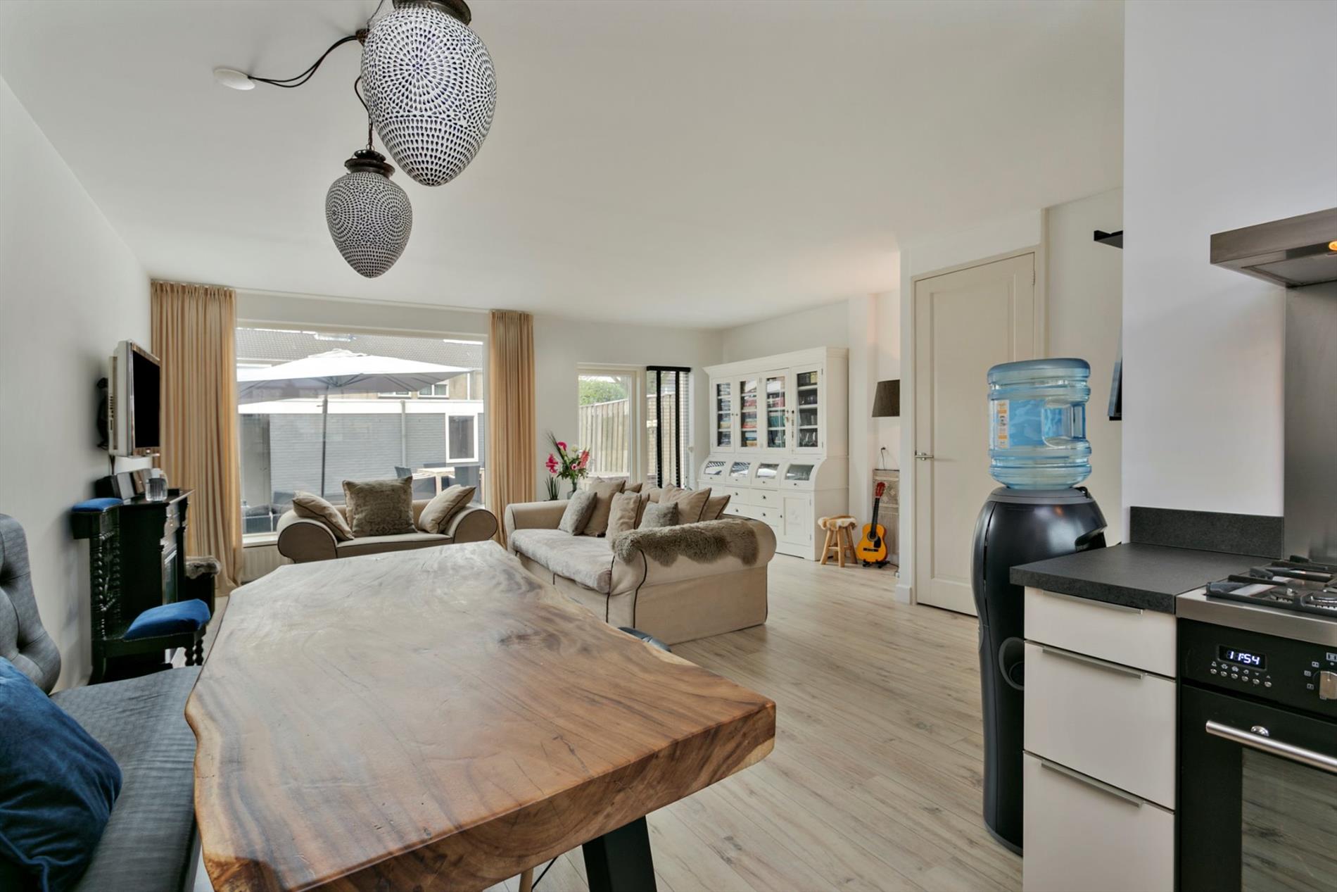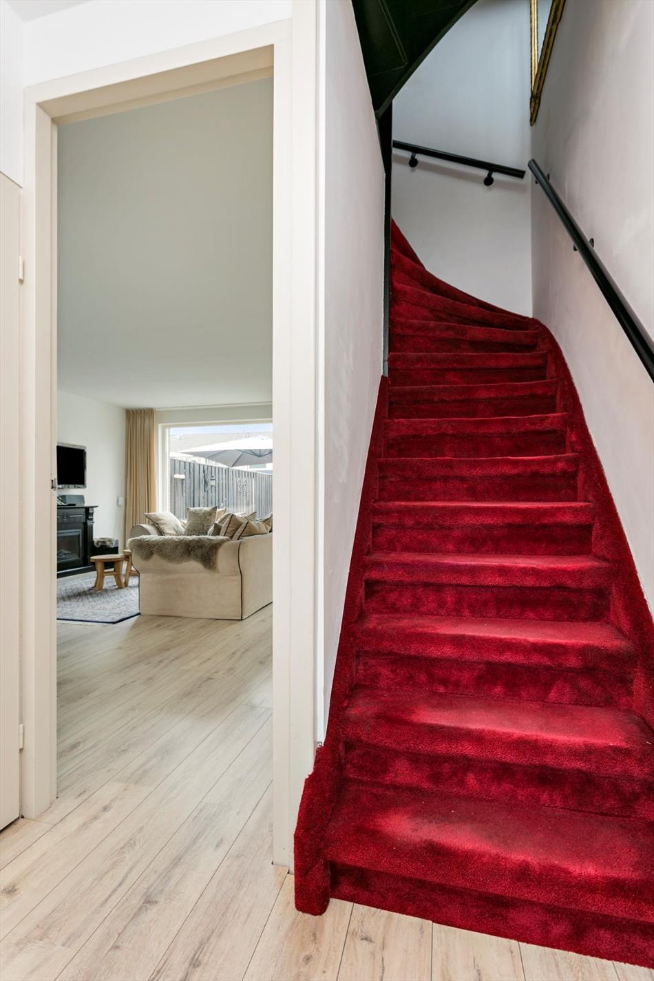 - De living is licht met speelse elementen. Overal zijn nieuwe kunstof kozijnen geplaatst met HR+ glas. Verder bevind zich onder de trap een praktische trapkast.