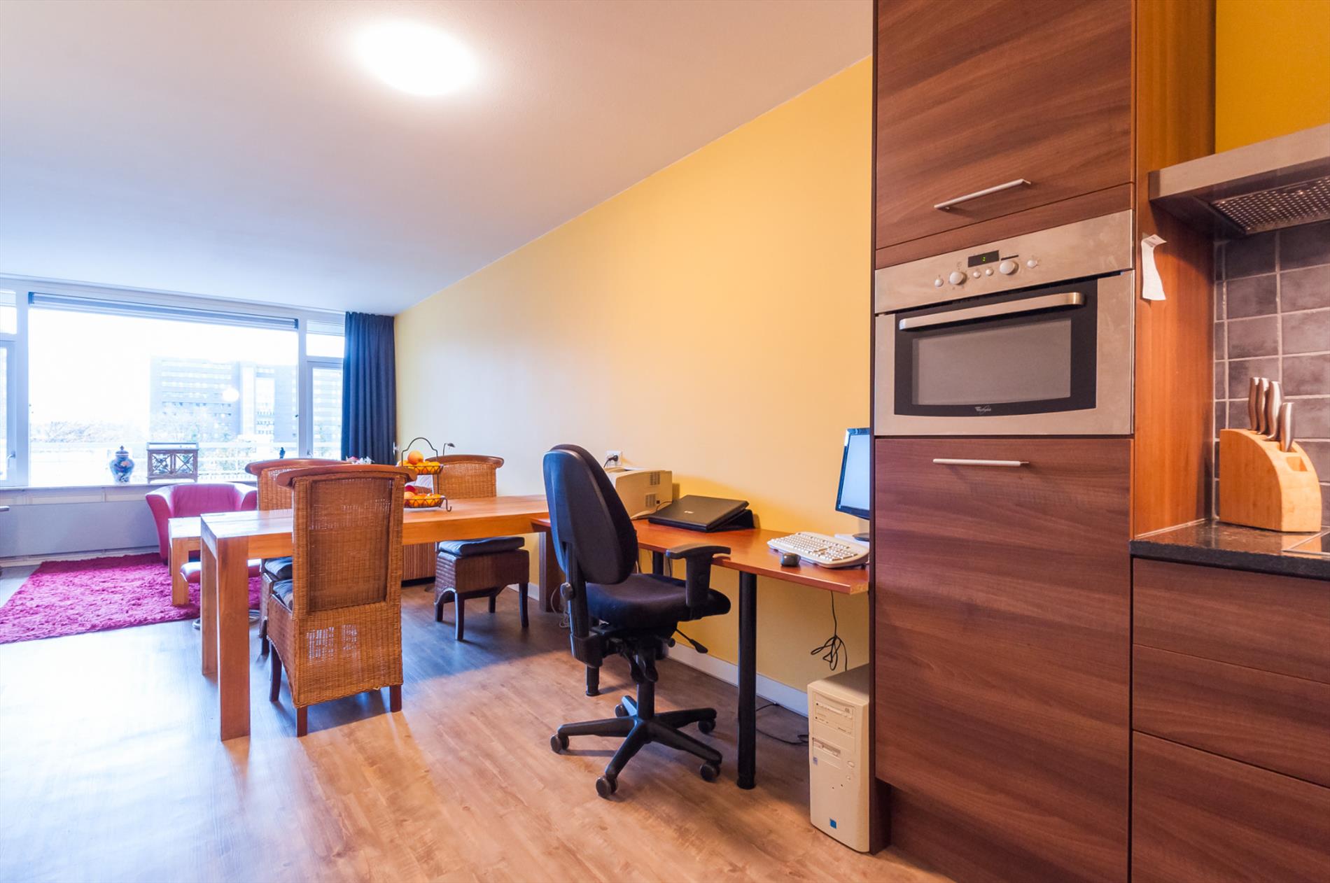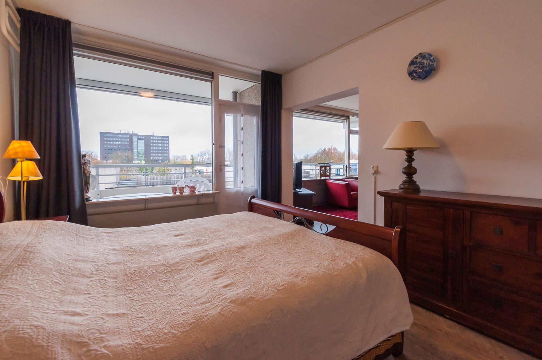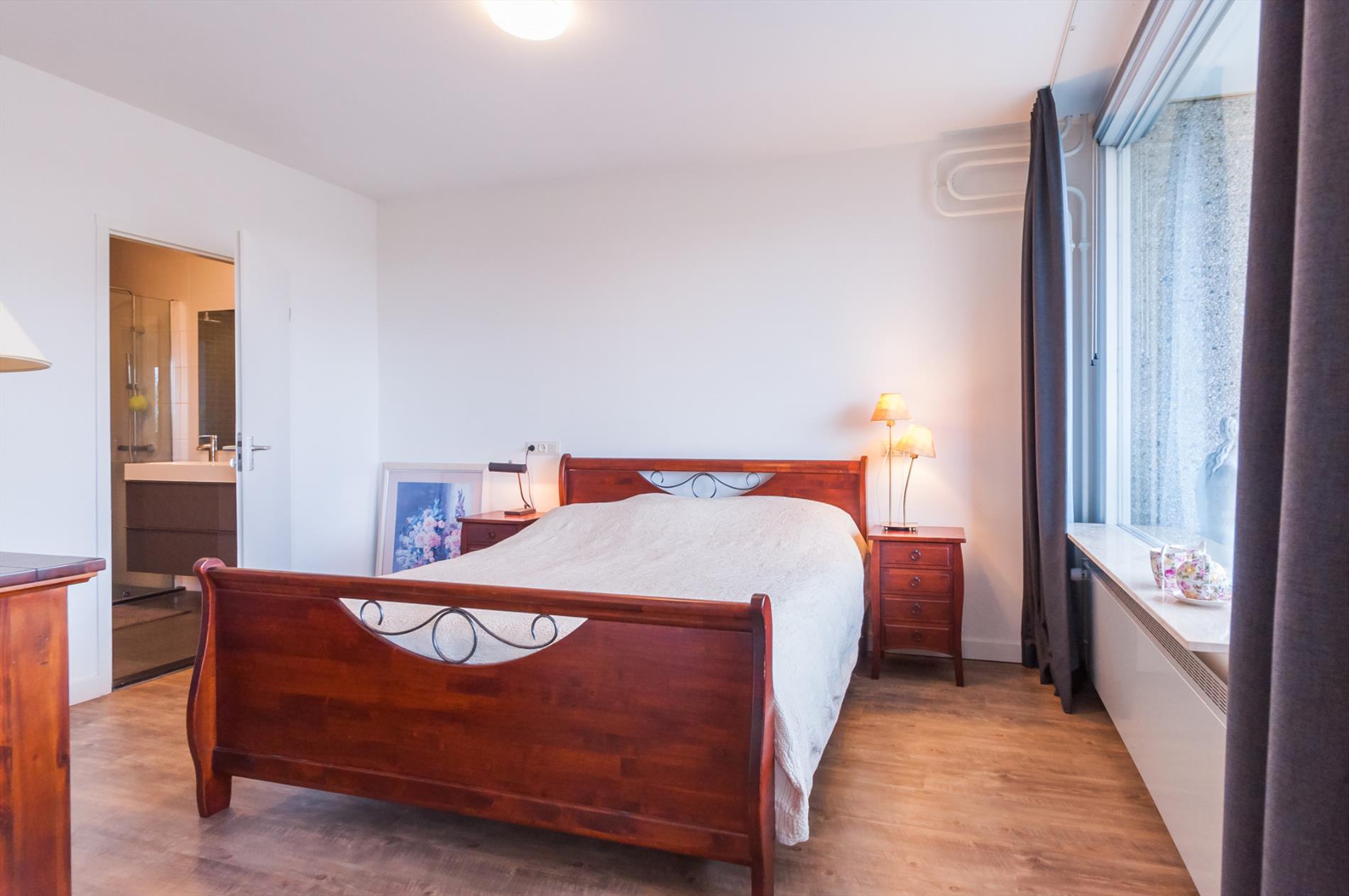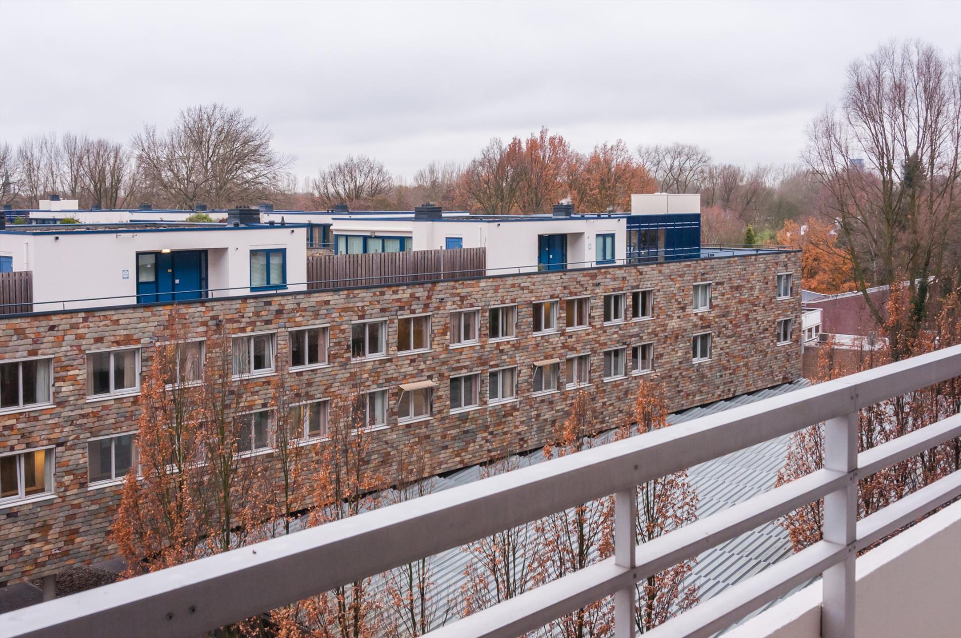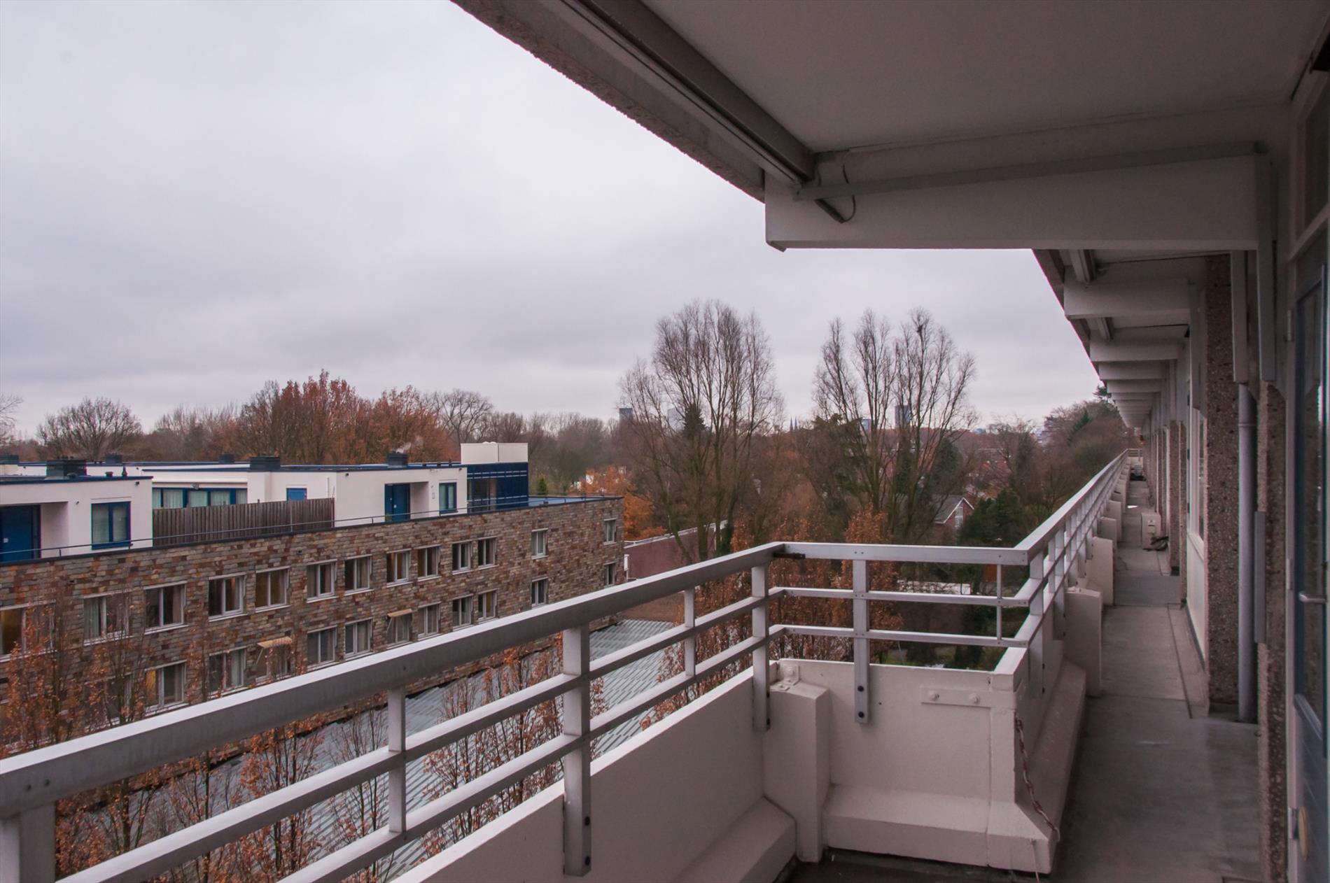 Ruime woonkamer. De woonkamer geniet veel lichtinval vanwege de grote raampartij. De open luxe hoekkeuken is voorzien van diverse onder- en bovenkasten, rvs spoelbak, keramische kookplaat en combi-oven. Vanuit de woonkamer heeft u toegang naar de royale slaapkamer. Vanuit de slaapkamer heeft u toegang tot het zonnige balkon gelegen op het Westen met een wijds uitzicht over Eindhoven en omgeving! De badkamer en het toilet zijn eveneens vanuit de slaapkamer te bereiken. Het appartement is voorzien van een keurige pvc vloerafwerking, stucwerk wanden en heeft buitenzonwering!