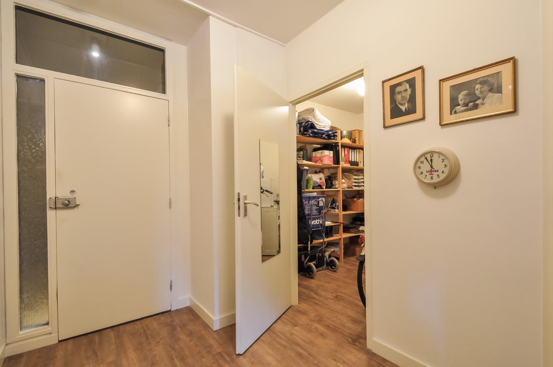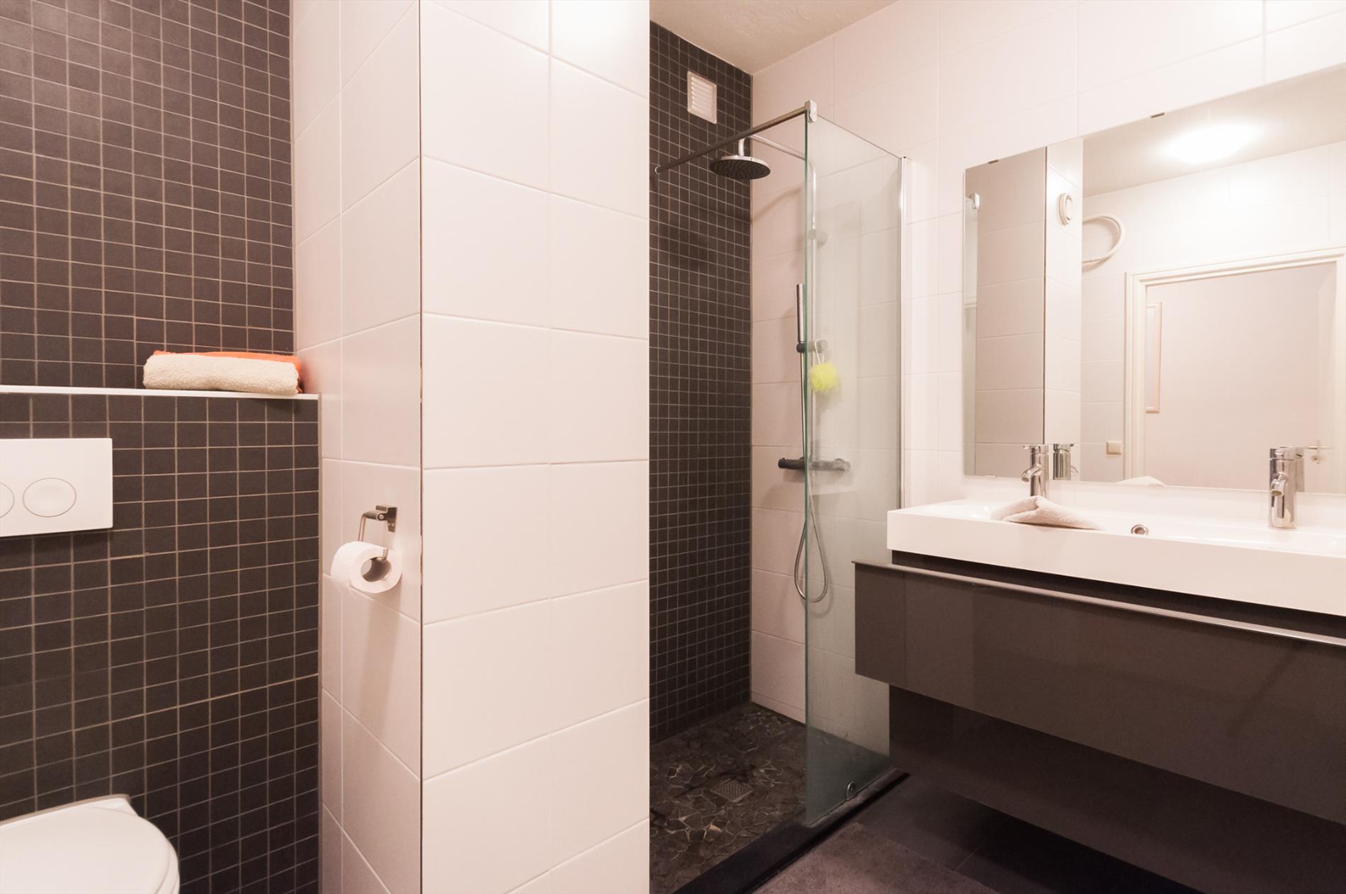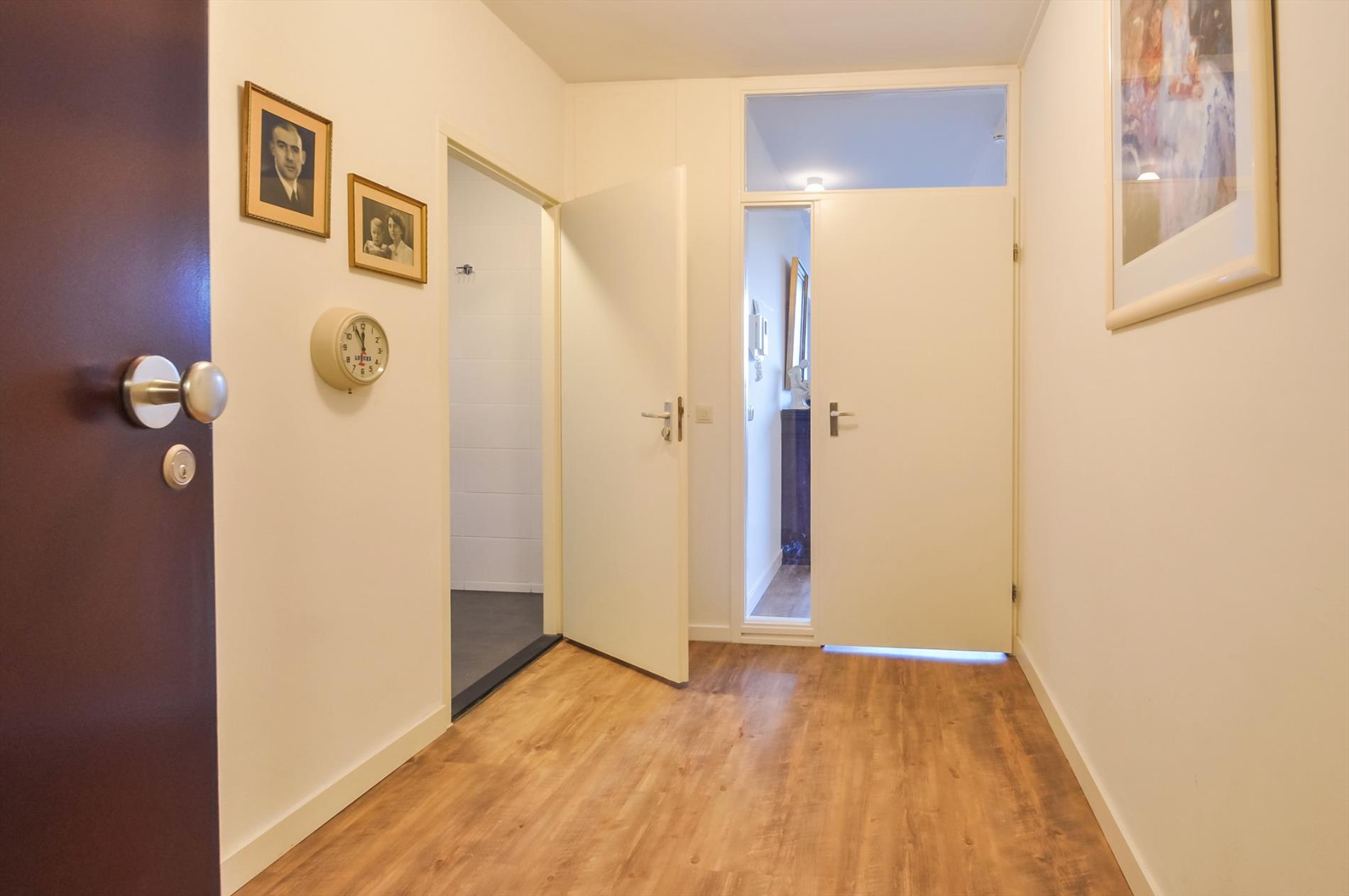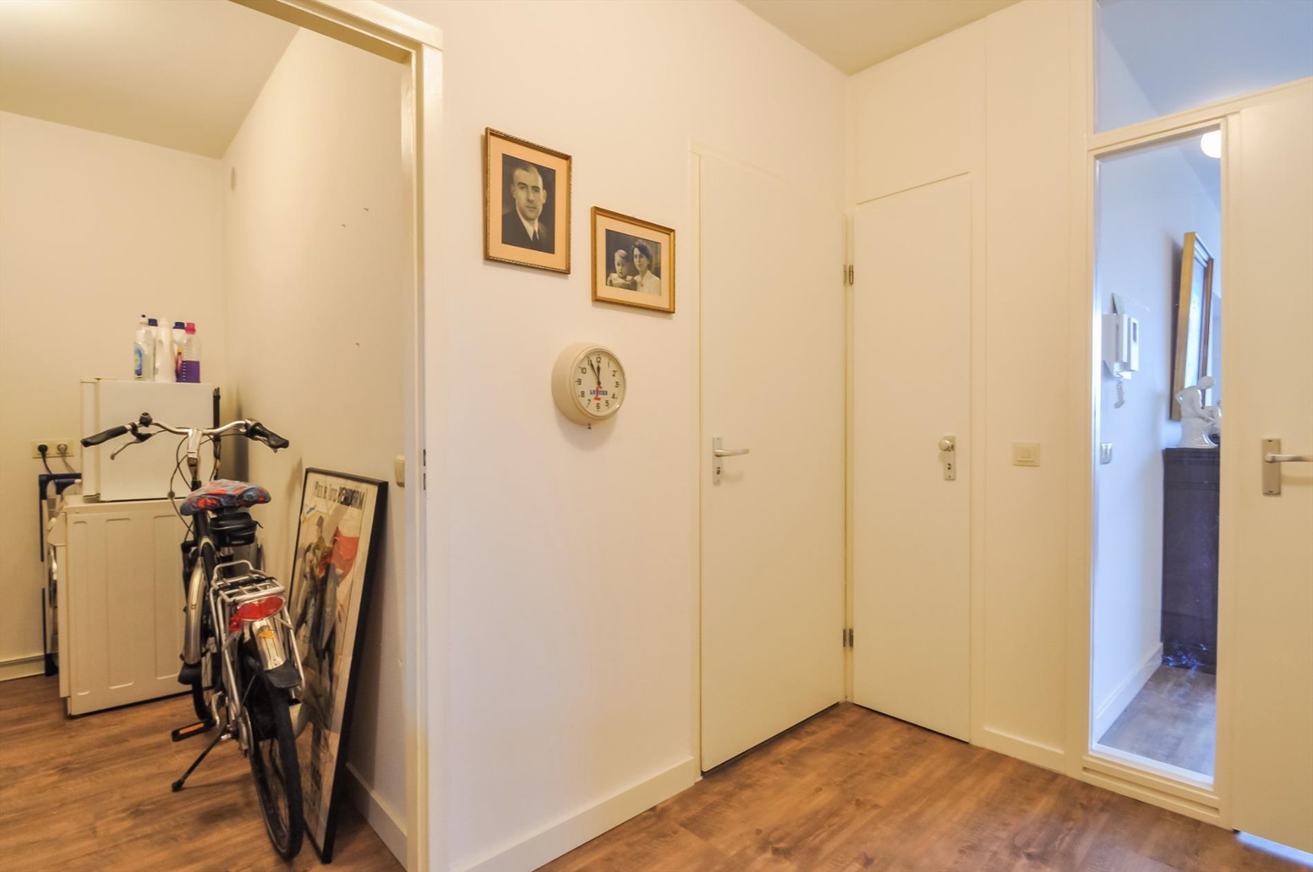 Vijfde etage: ruime hal met meterkast, toegang tot woonkamer, toilet/badkamer en inpandige berging. De inpandige berging biedt voldoende bergruimte en heeft een aansluiting voor wasapparatuur. De luxe betegelde badkamer is voorzien van een inloopdouche, vaste wastafel met dubbele kranen in meubel, hangtoilet.