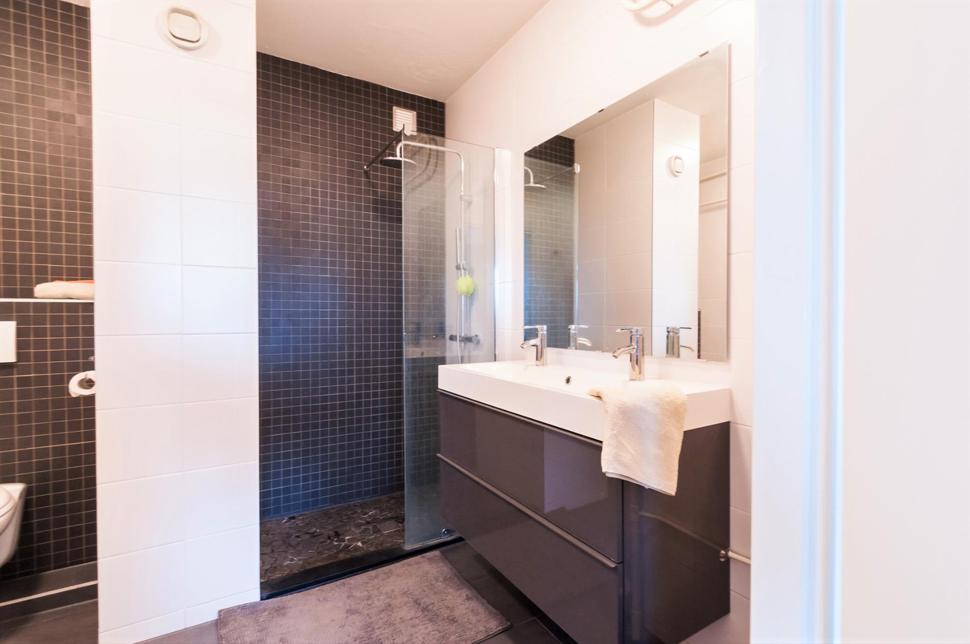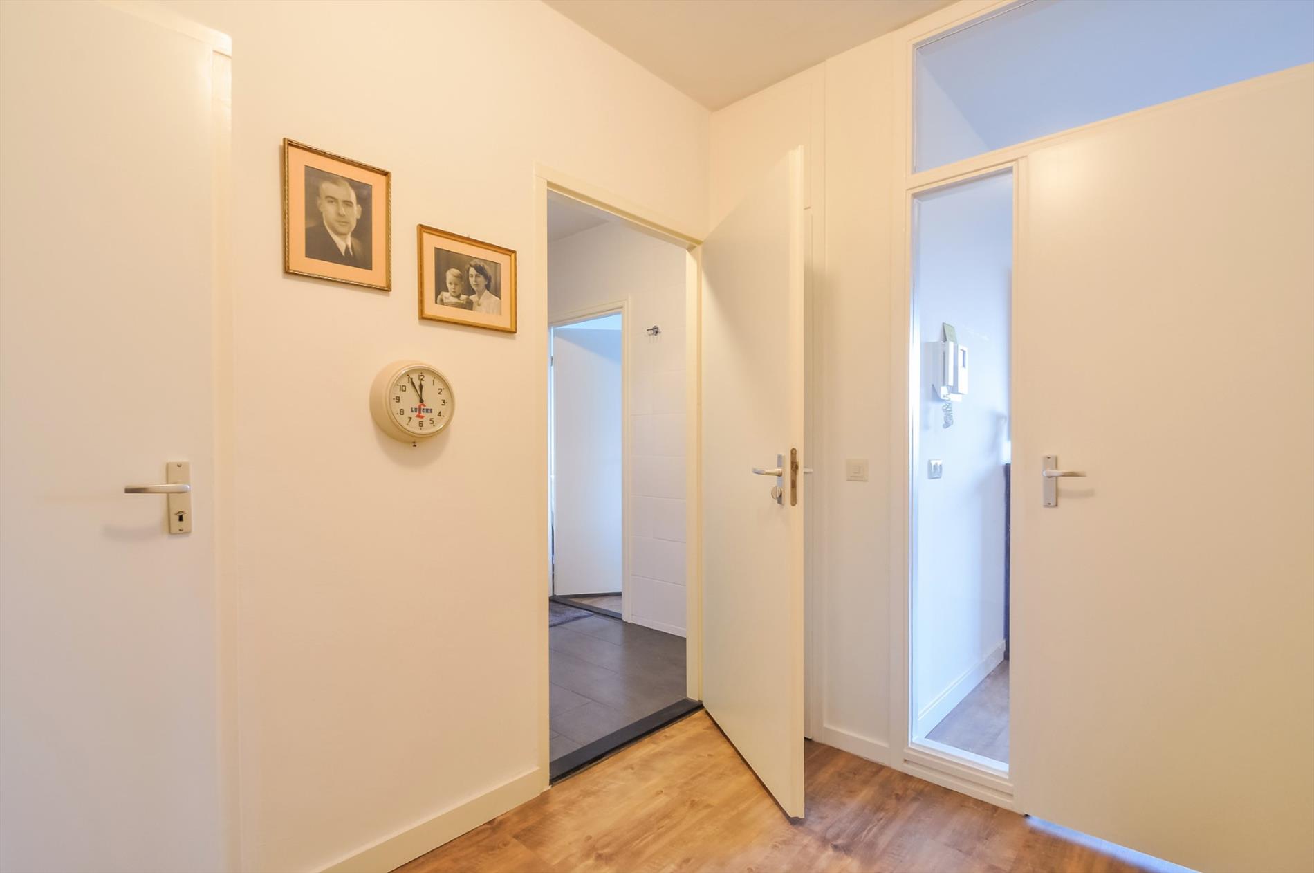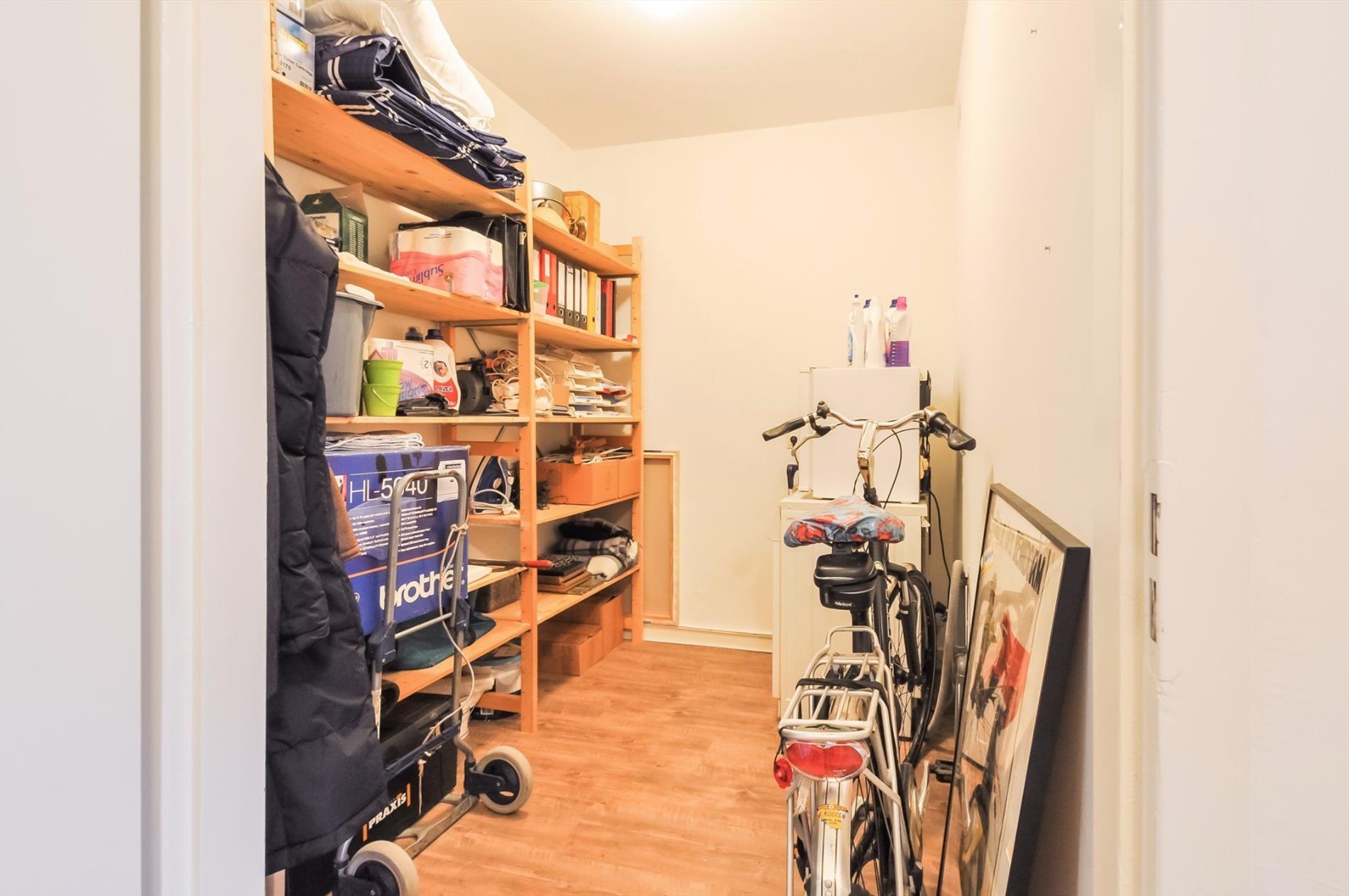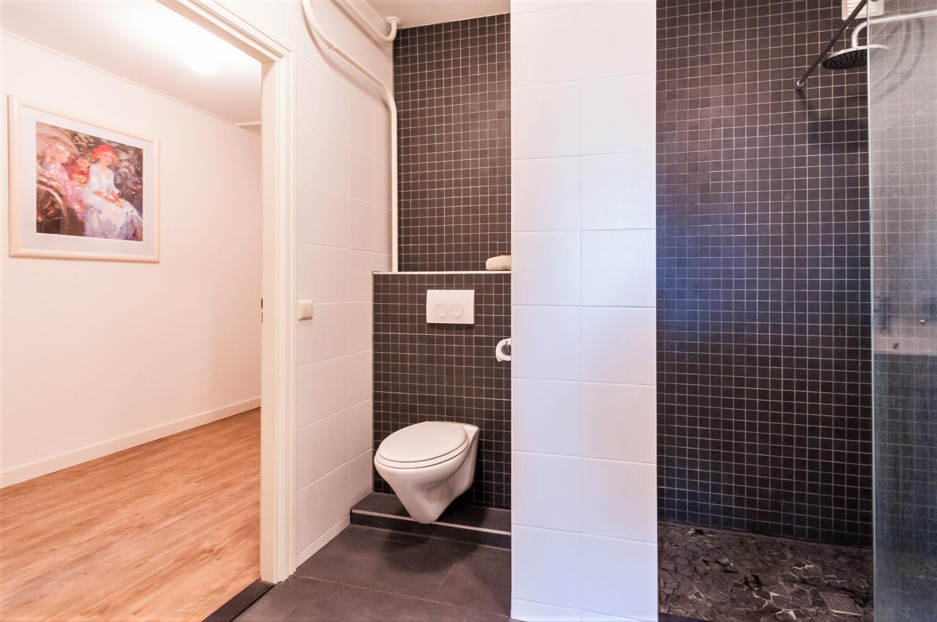 Vijfde etage: ruime hal met meterkast, toegang tot woonkamer, toilet/badkamer en inpandige berging. De inpandige berging biedt voldoende bergruimte en heeft een aansluiting voor wasapparatuur. De luxe betegelde badkamer is voorzien van een inloopdouche, vaste wastafel met dubbele kranen in meubel, hangtoilet.