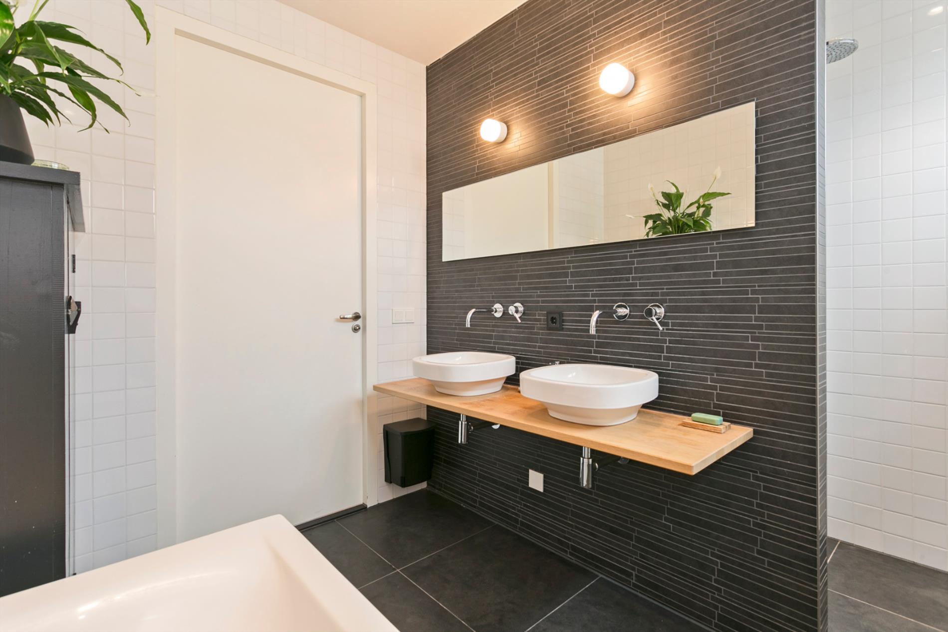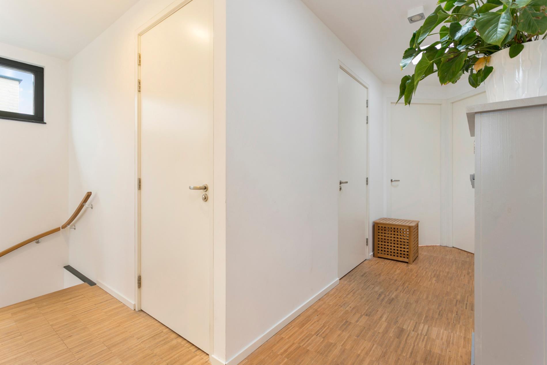 Via prachtige eiken trap in de vide is de overloop te bereiken op de eerste verdieping. De masterbedroom van circa 22 m² aan de voorzijde van de woning met inloopkast en toegang middels een schuifdeur tot de kleinste badkamer. Deze badkamer is voorzien van een inloopdouche en een wastafel met wandkraan. Tevens is vanuit deze hoofdslaapkamer toegang middels een schuifpui tot het royale dakterras (circa 52m2) op het zuid-westen voorzien van grote terrastegels. Op de eerste verdieping liggen er verder nog 3 slaapkamers, een separate toiletruimte en de hoofdbadkamer. Deze luxe badkamer is uitgerust met een eikenblad met 2 wastafelkommen, duo-ligbad en inloopdouche allen met inbouwkranen, het geheel is afgewerkt met mooi wand- en vloertegelwerk. Lichttoetreding op de overloop door 2 dakkoepels. De gehele eerste verdieping is afgewerkt met stucwerkwanden- en plafonds en een eiken vloer.
