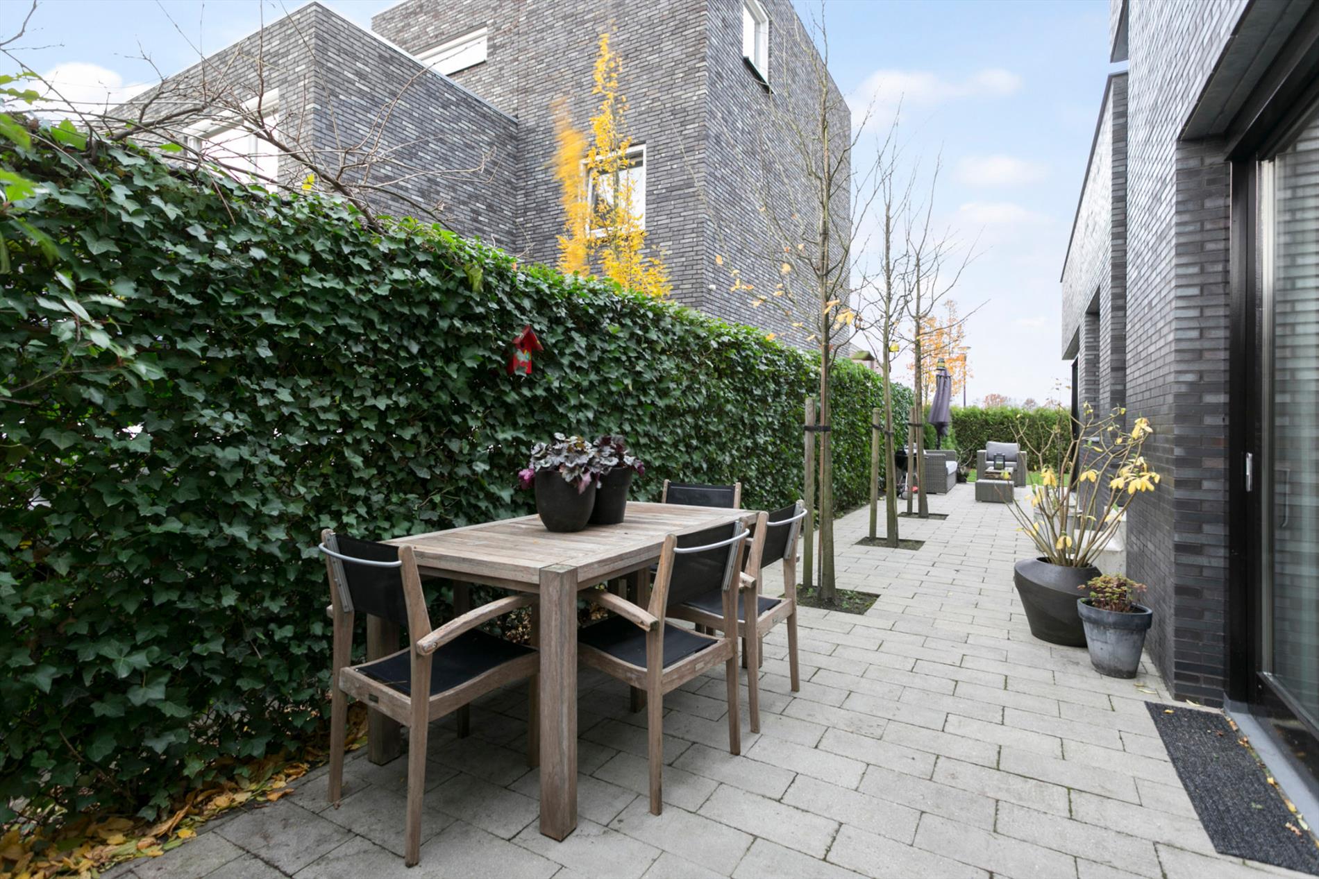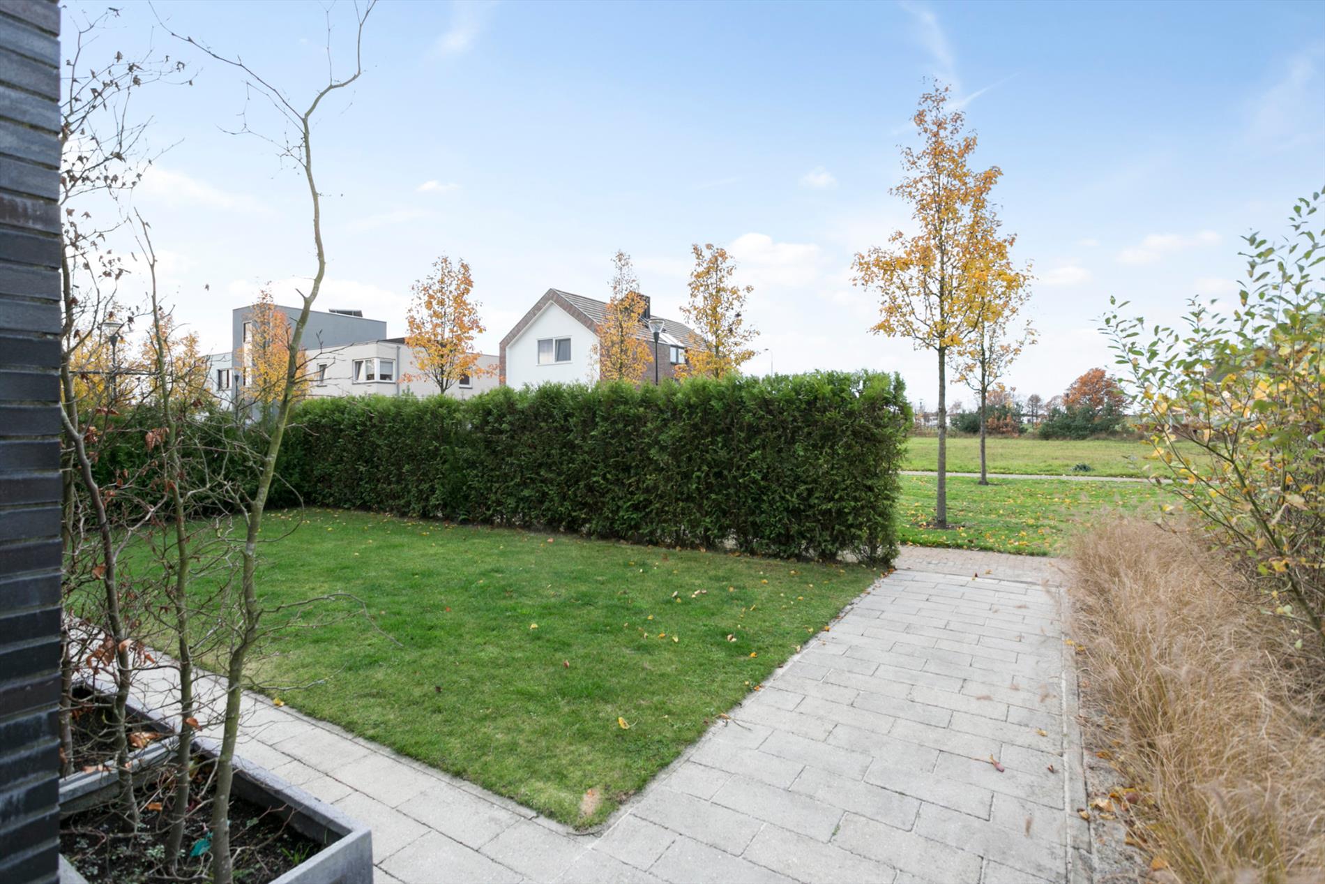 De woning heeft een voor- en zijtuin, netjes aangelegd met gazon, bomen en overal eenzelfde bestrating. Door de diepte van de tuin, kan ook optimaal van de zon genoten worden. De kavel is afgewerkt met een groene omlijsting, te weten hekwerk met Hedera en een coniferenhaag. De woningen in Waterrijk kennen het zogenoemde Brabantse achterommetje, via het achterpad bereikt men de achterzijde van de woning met 2 parkeerplaatsen op eigen terrein. Eén parkeerplaats is gelegen onder de carport.