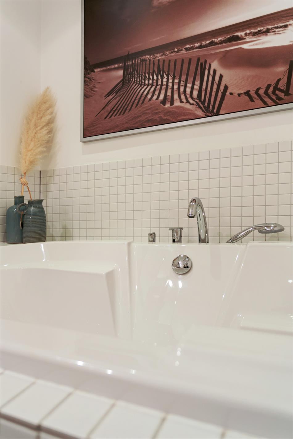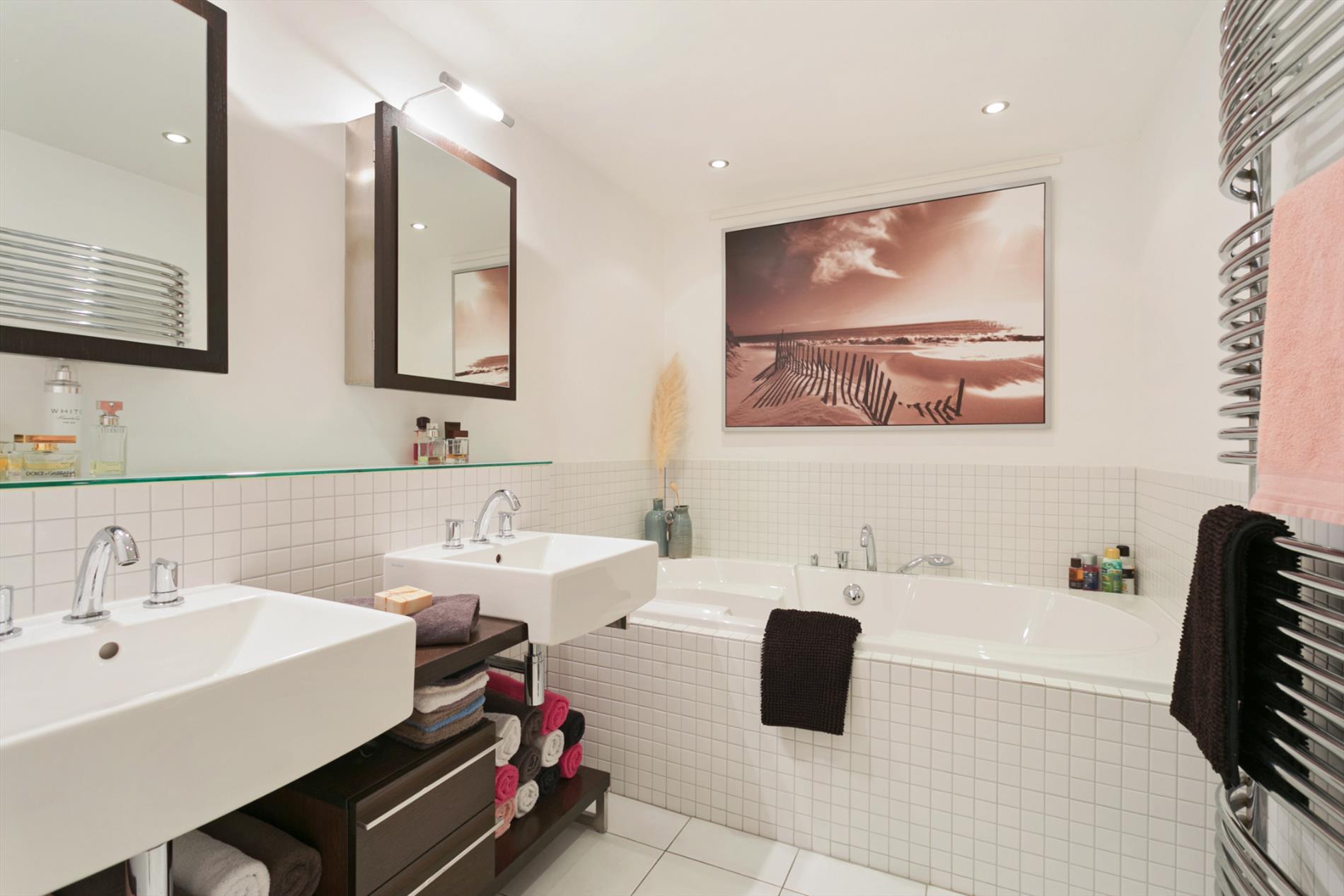 Luxe en ruime badkamer voorzien van een groot Villeroy en Boch ligbad, dubbele vaste wastafels op en wengéblad en wengé onderkasten, stijlvolle spiegelkasten met verlichting, separate inloopdouche en designradiator. De badkamer is uitgevoerd in fraai tegelwerk op wanden en vloer (voorzien van vloerverwarming) en luxe kranen.