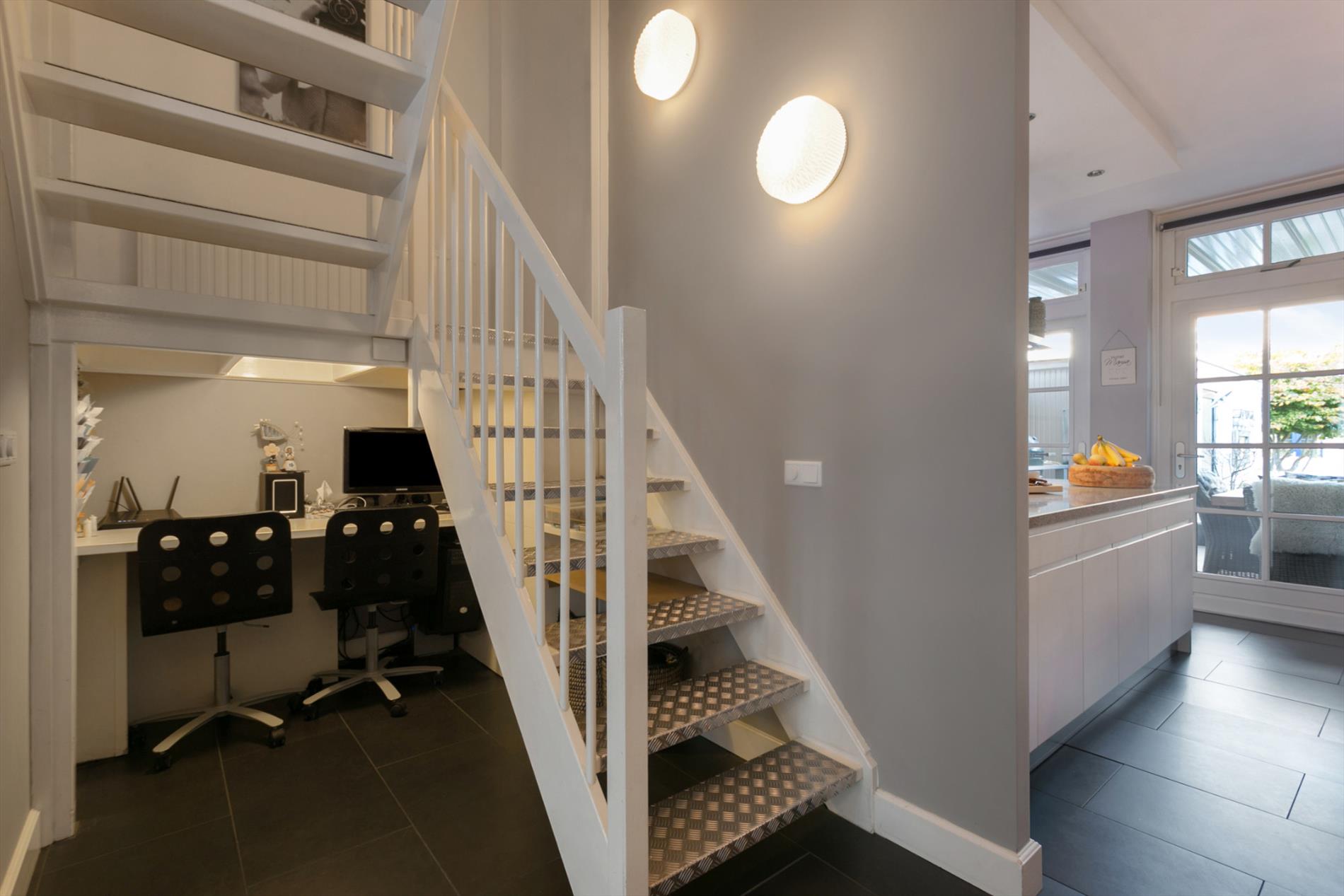 De woonkamer biedt plaats aan een ruime zithoek gesitueerd aan de voorzijde van de woning. De gehele begane grondvloer is voorzien van een keurige tegelvloer uiteraard voorzien van vloerverwarming. De muren en het plafond zijn voorzien van stucwerk. Vanuit de woonkamer is via een mooie open bordestrap de toegang naar de verdiepingen. De ruimte onder de trap (de hoogte is 1.50 m) kan bijvoorbeeld prima als speel-/studyhoek worden gebruikt.