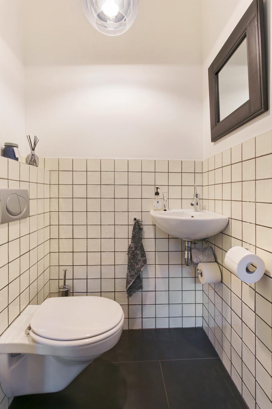 Vanuit de overloop is de toegang naar het separate tweede hangtoilet, kleurrijk betegeld met Portugees tegelwerk.
