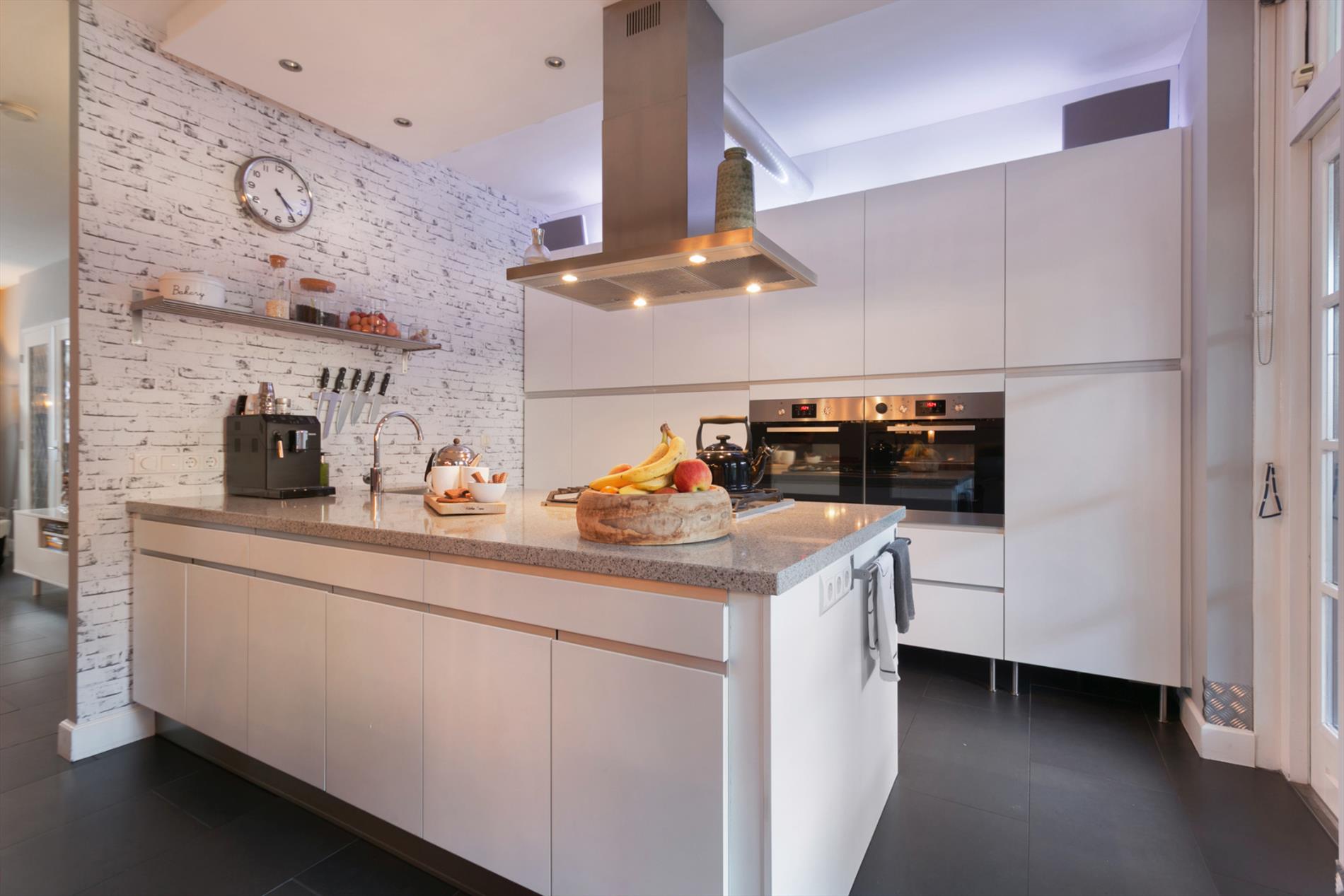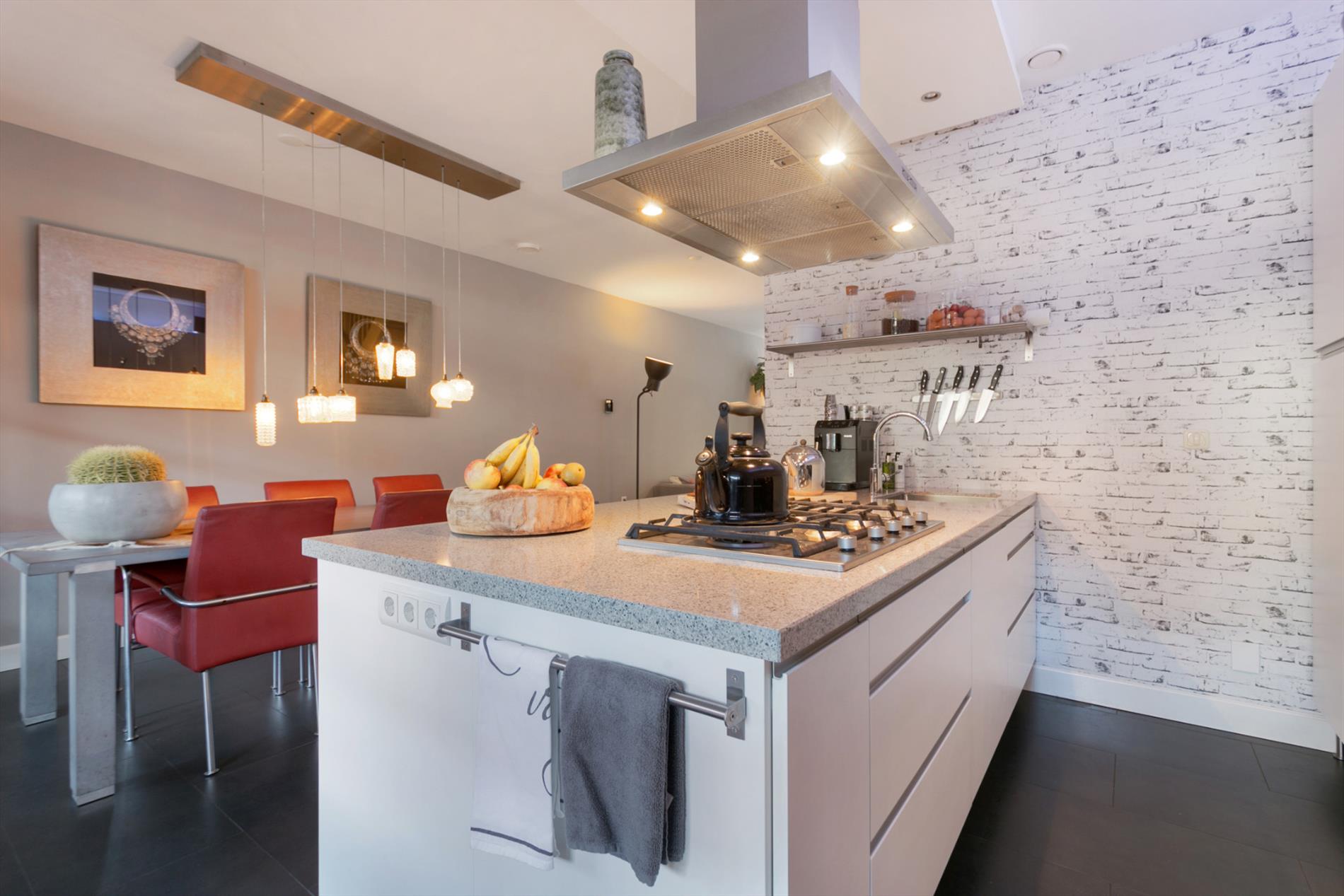 Moderne open en luxe keuken gelegen aan de achterzijde. De keuken is geheel vernieuwd in 2012 en voorzien van veel kastruimte, een kookeiland en composiet werkblad. Verder is de keuken voorzien van de volgende inbouwapparatuur: