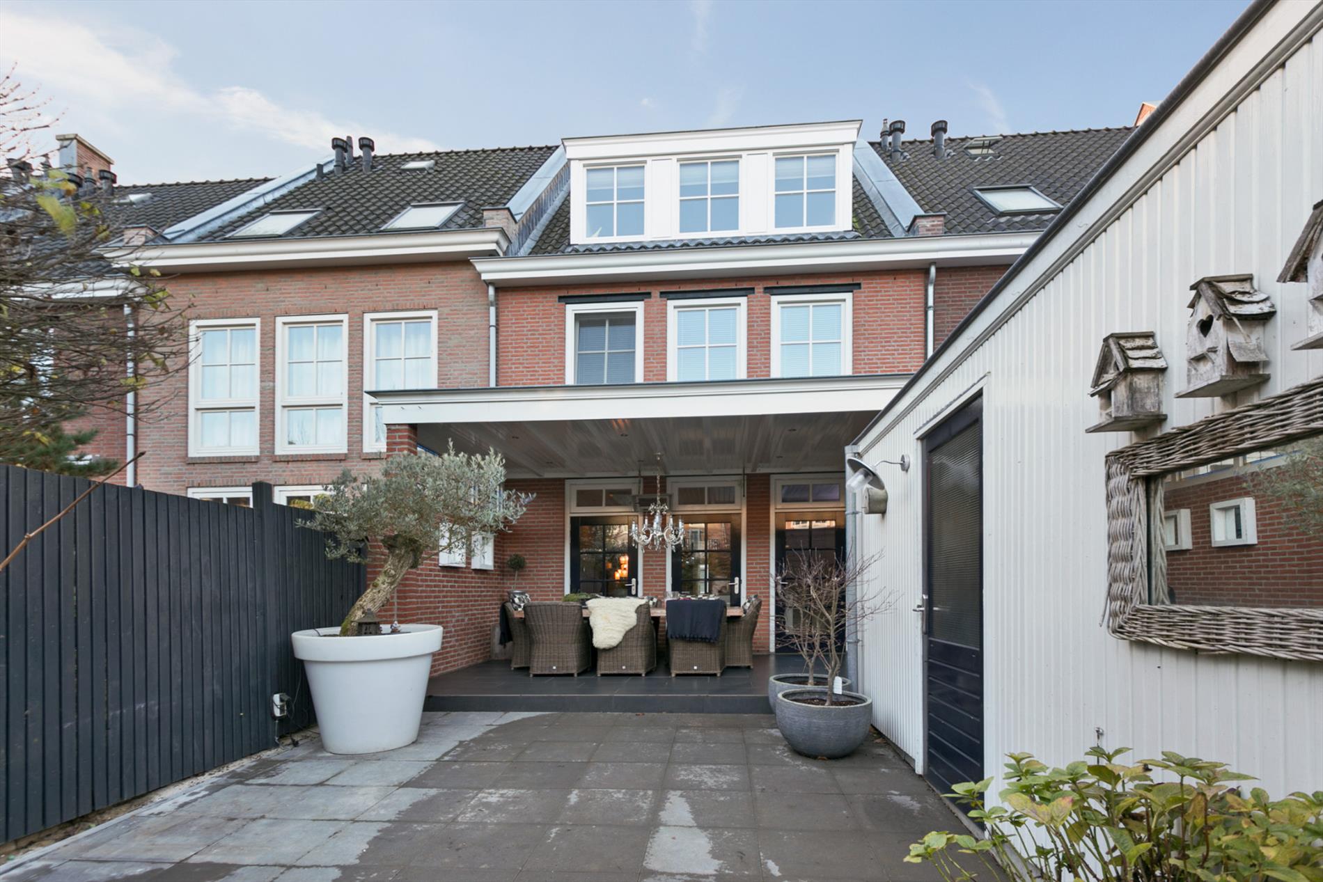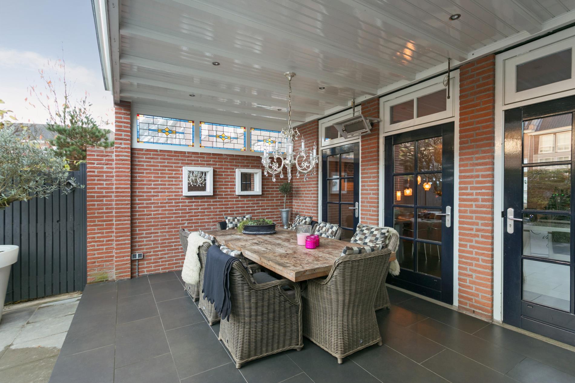Vanuit de drie tuindeuren in de achtergevel is de toegang tot de prachtige veranda, de achtertuin en berging.