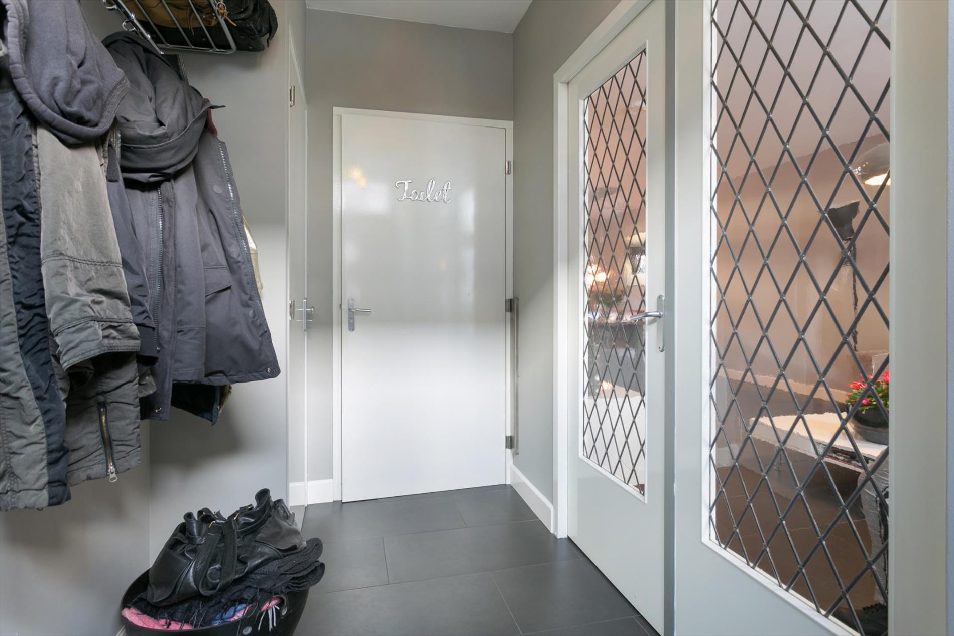 Entree: hal met toilet en uitgebreide meterkast (11 groepen voorzien van aardlek). Vanuit de hal bereik je via dubbele openslaande deuren, voorzien van glas in lood, de living.