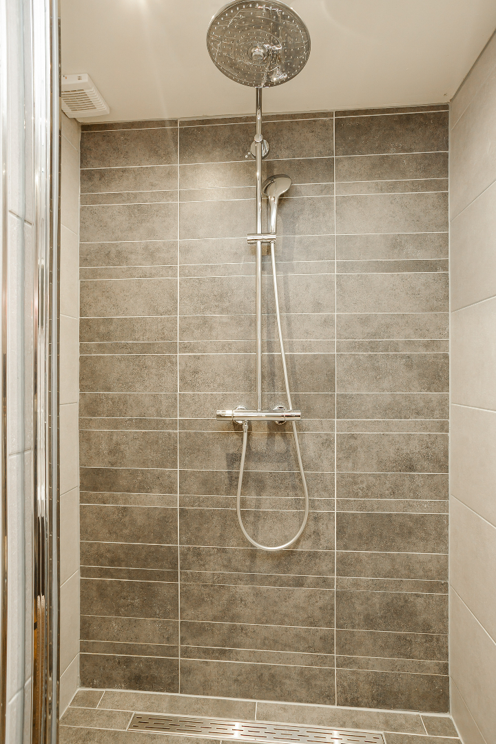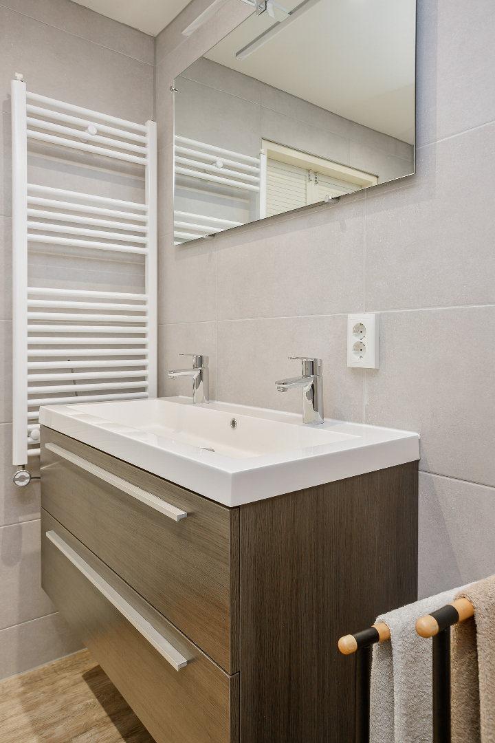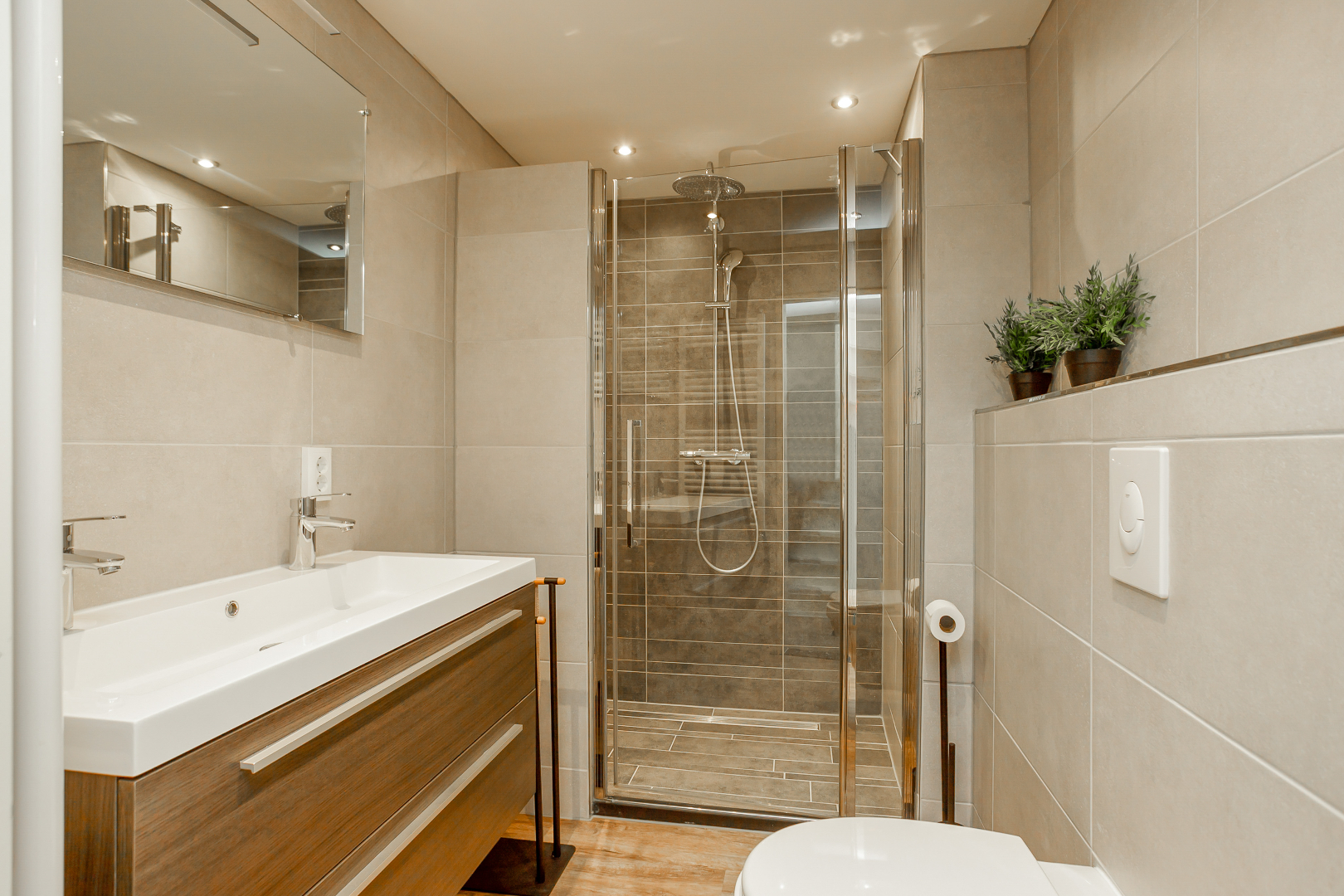 Middels overloop met royale inbouwkast toegang tot 3 slaapkamers. De overloop alsmede alle slaapkamers zijn voorzien van een lichte laminaatvloer. Middels dubbele klapdeur met fraaie moderne badkamer. Deze is geheel betegeld en voorzien van een wastafel met mengkraan, wandcloset, decorradiator, grtote inloopdouche met glazen wand, wandkast, inbouwplafond met halogeenspots en mechanische afzuiging