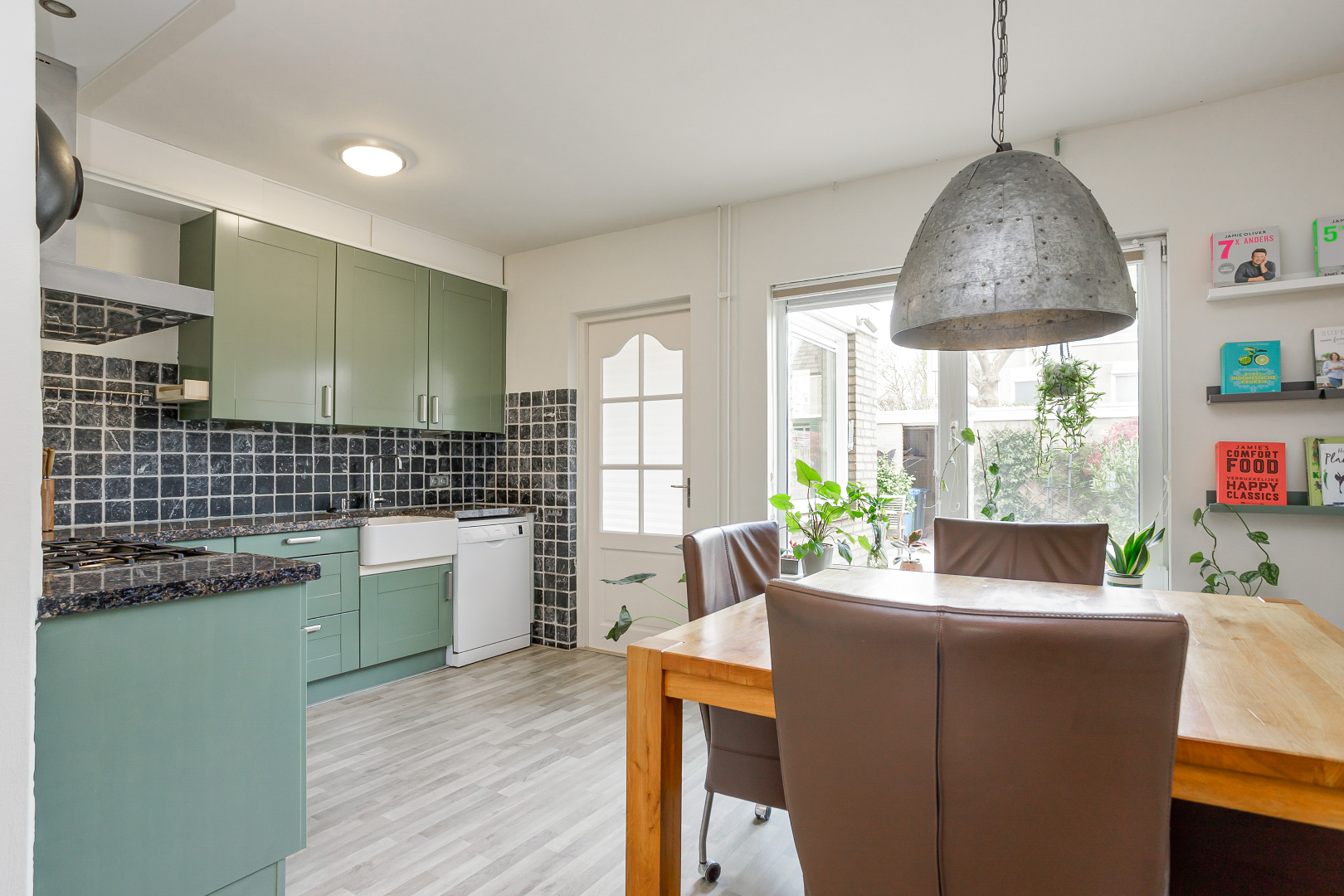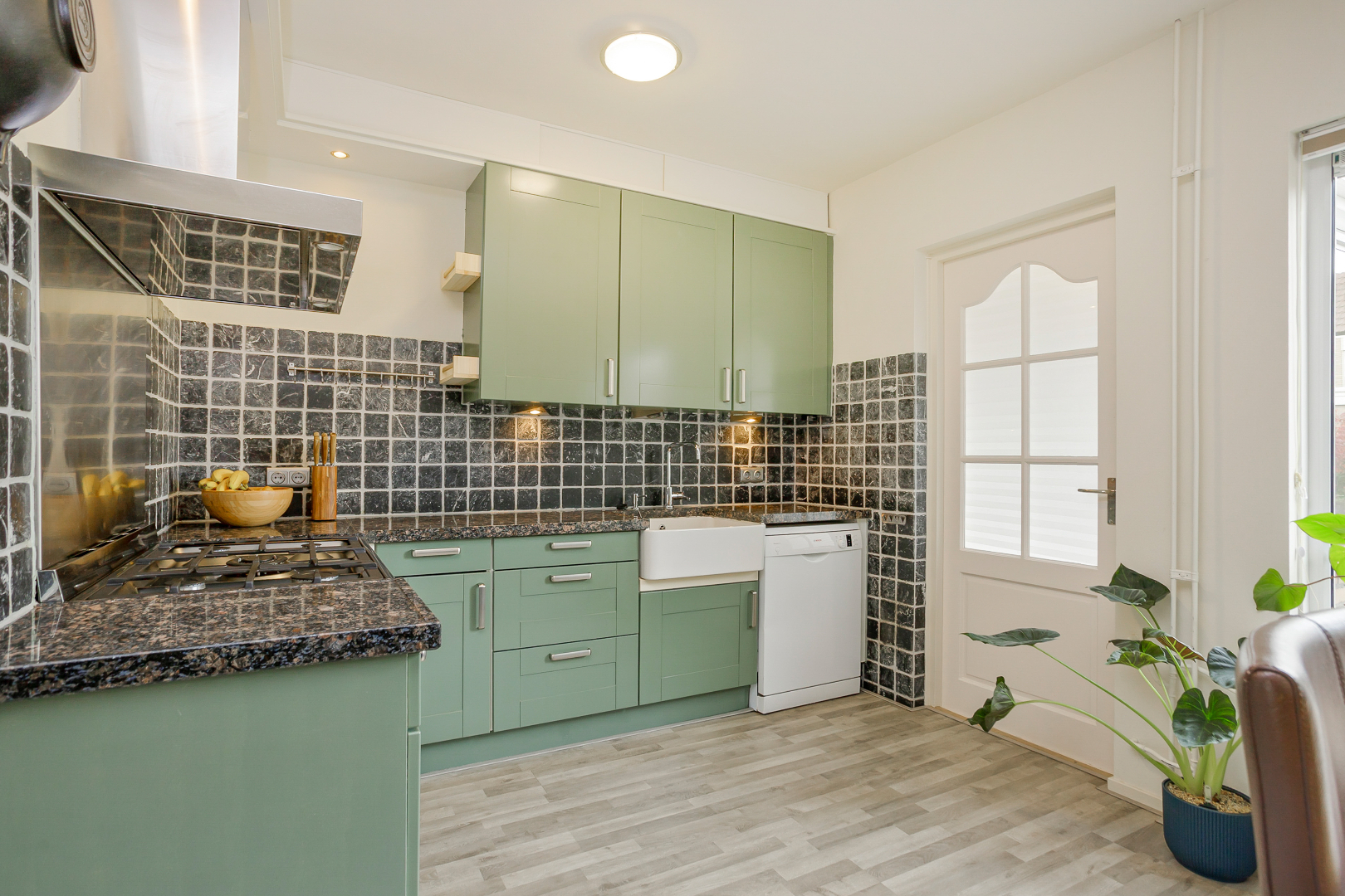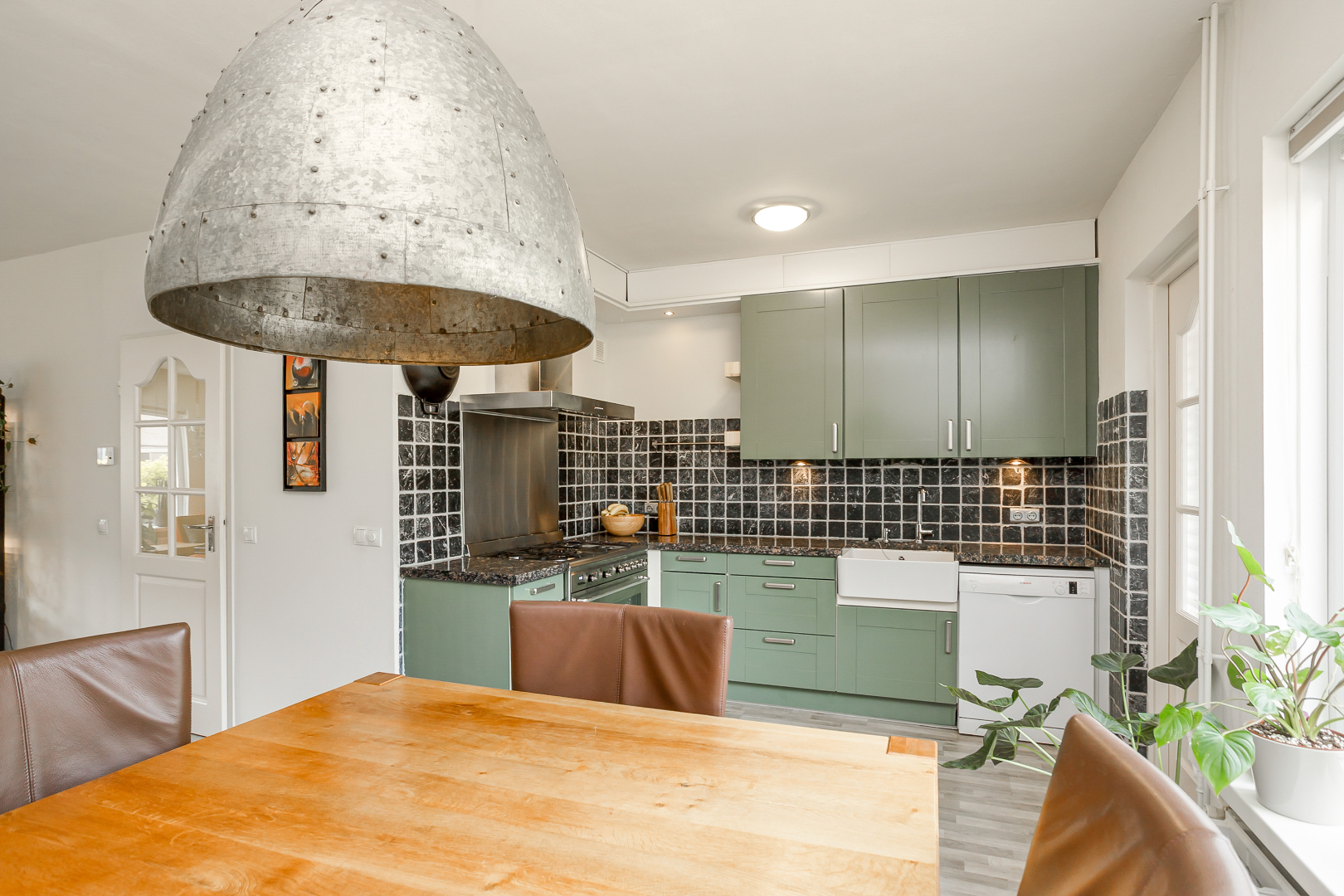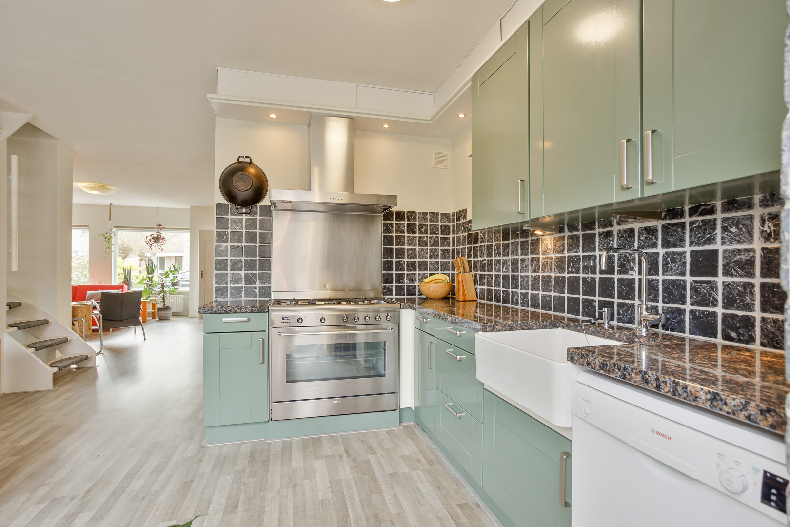 Semi-open keuken met zeer fraaie eigentijdse hoekinrichting voorzien van: - granieten aanrechtblad - grote en moderne rechthoekige spoelbak - 5-pits Pelgrim gaskookplaat - RVS afzuig-koof - Siemens vaatwasser. Bijkeuken voorzien van tegelvloer en aansluiting voor wasmachine.