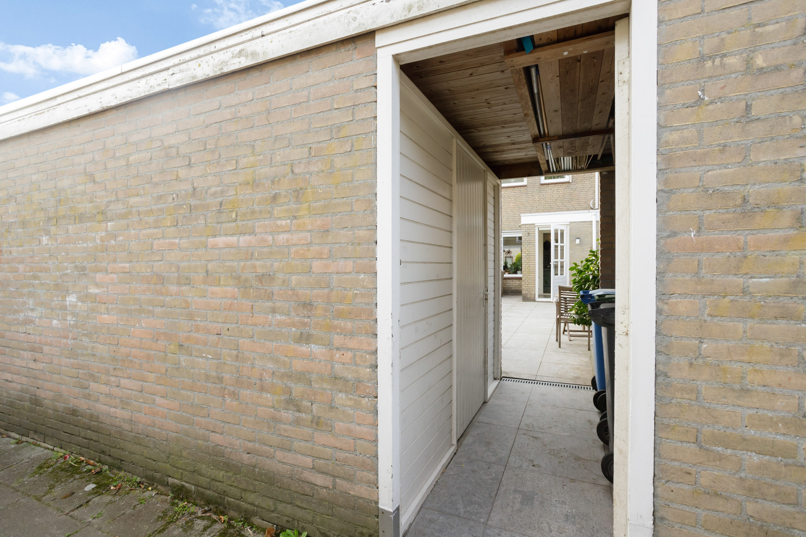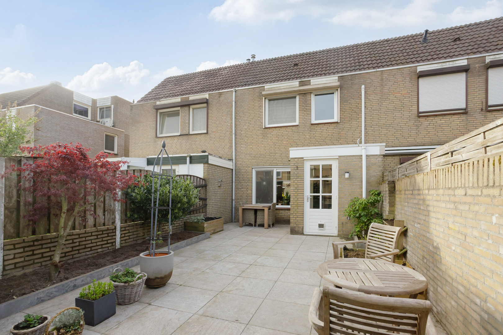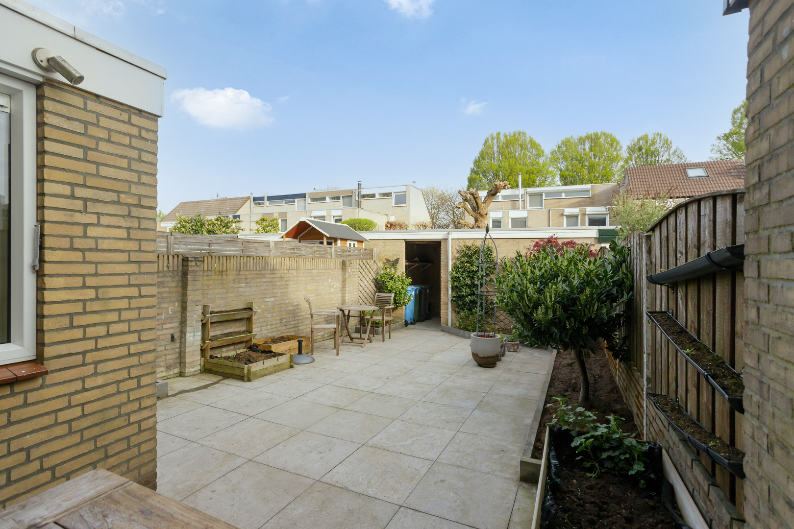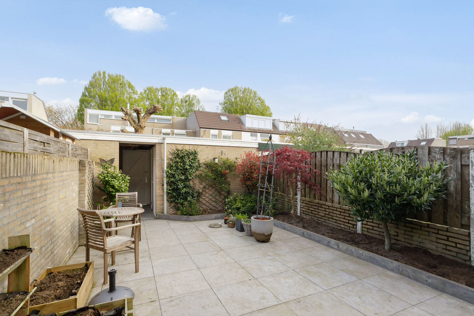 Onderhoudsarme achtertuin gelegen op het noordoosten, berging, bestrating en achterom.