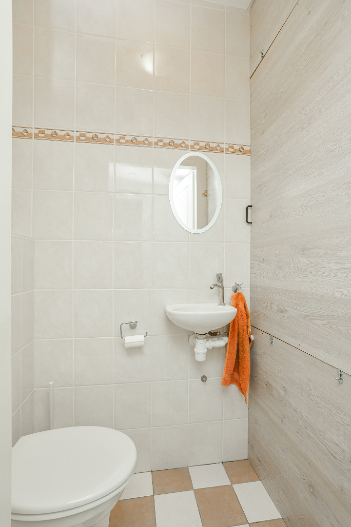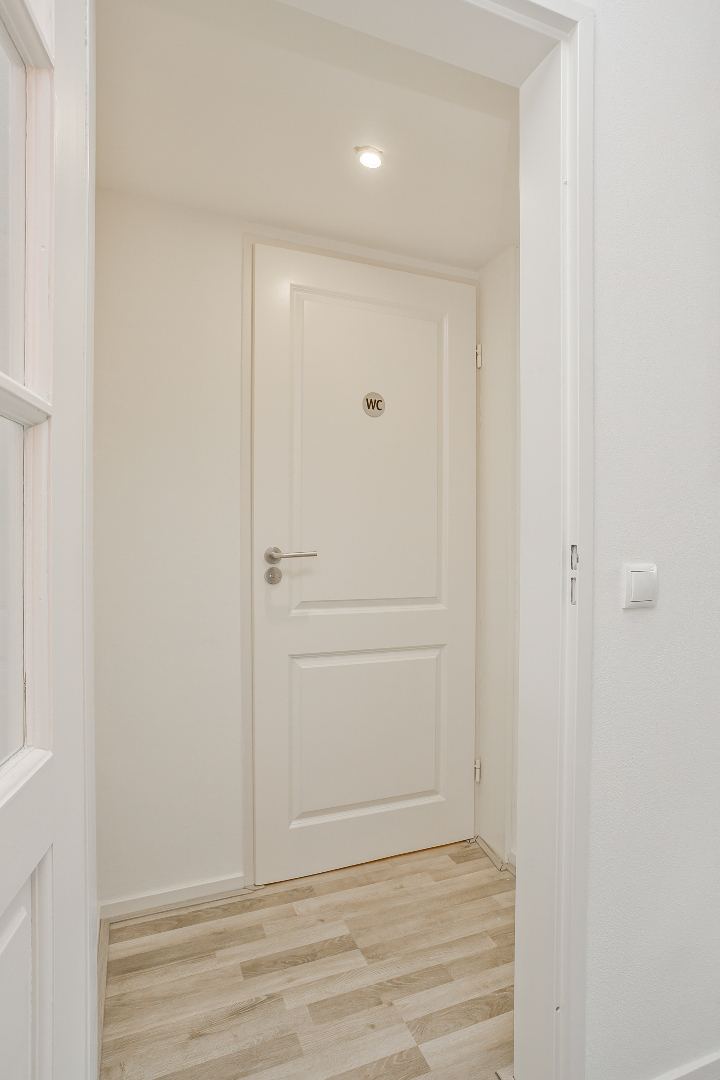 Via tussenportaal naar vernieuwde toiletruimte met wandcloset en fontein. Opstelling c.v.-combiketel (2020).