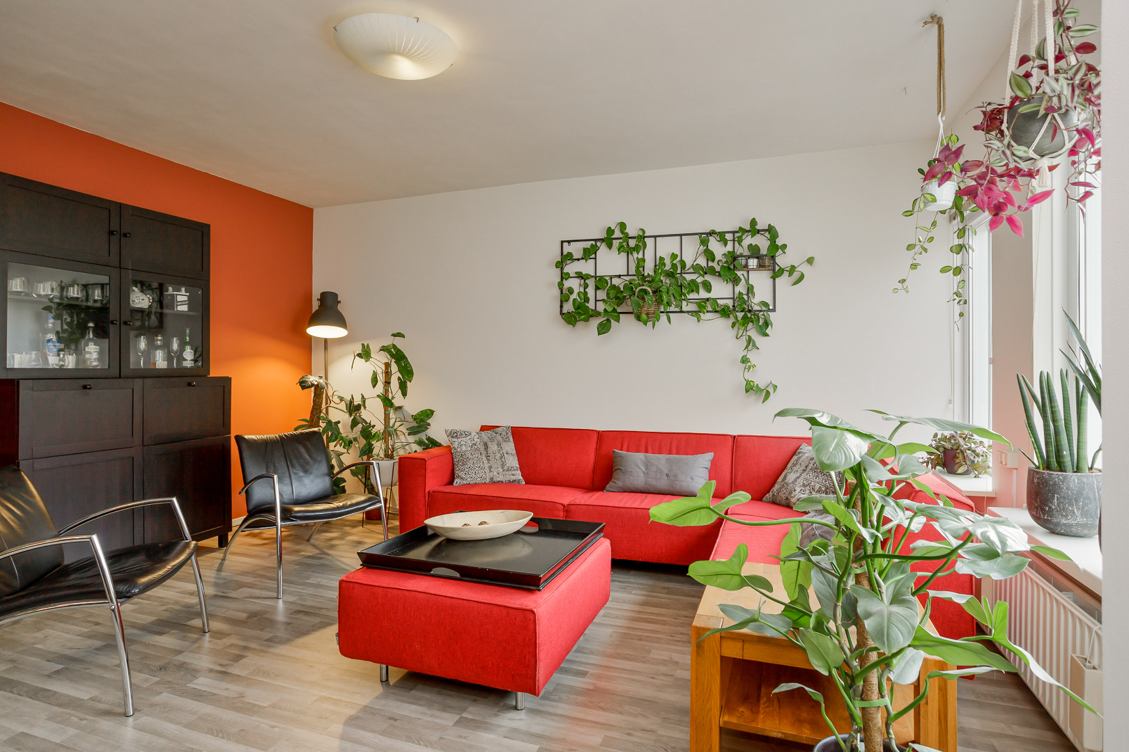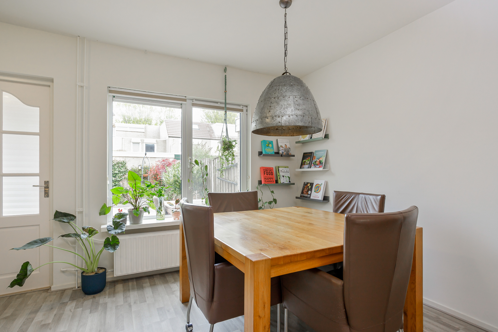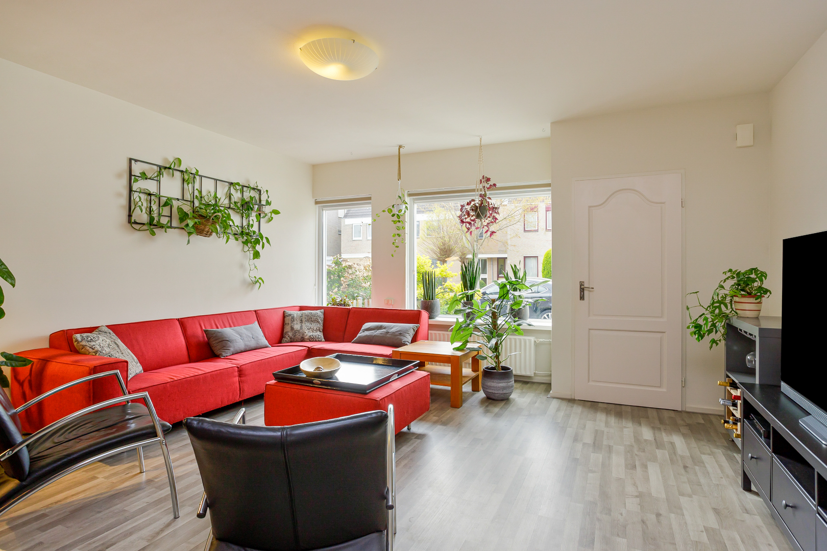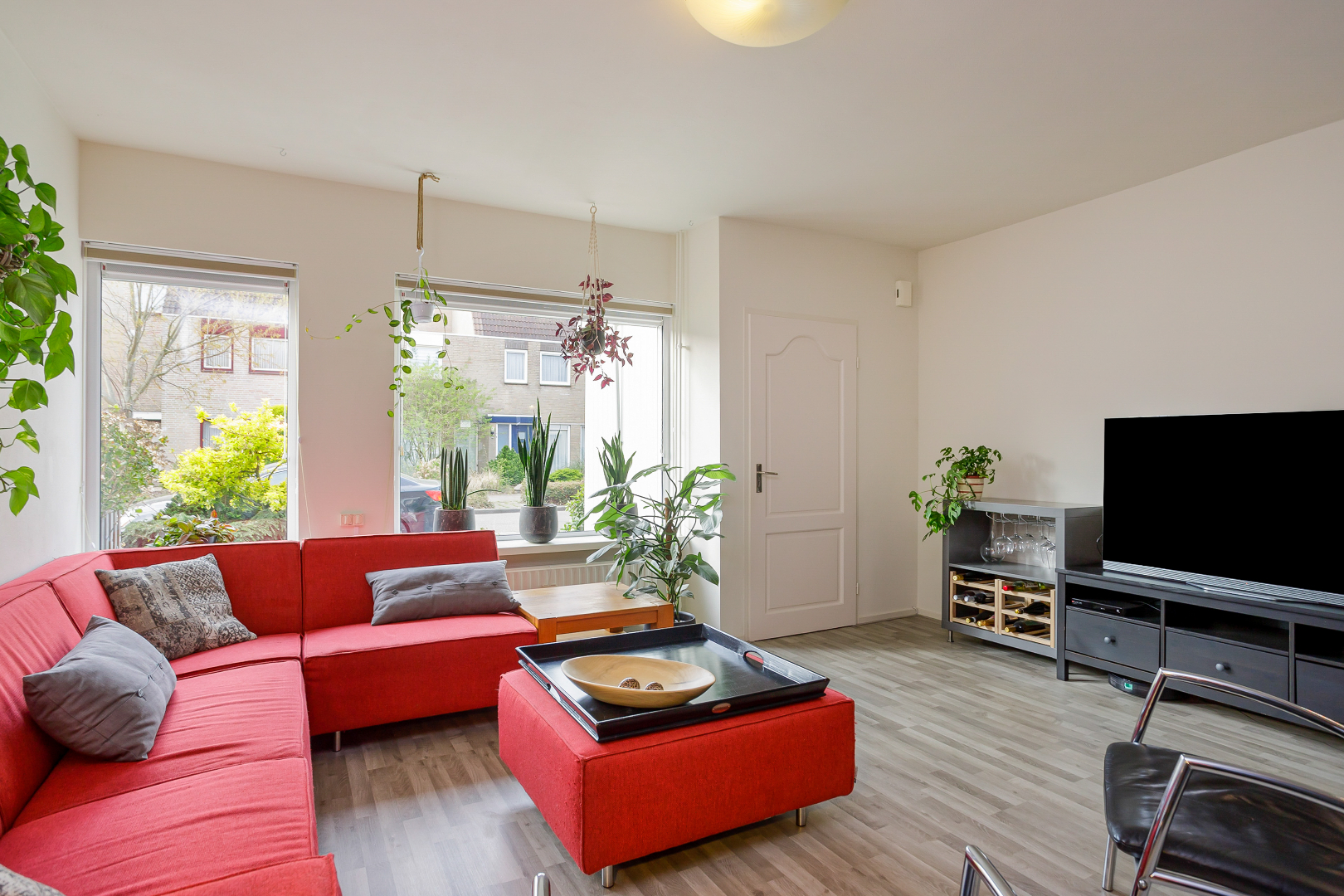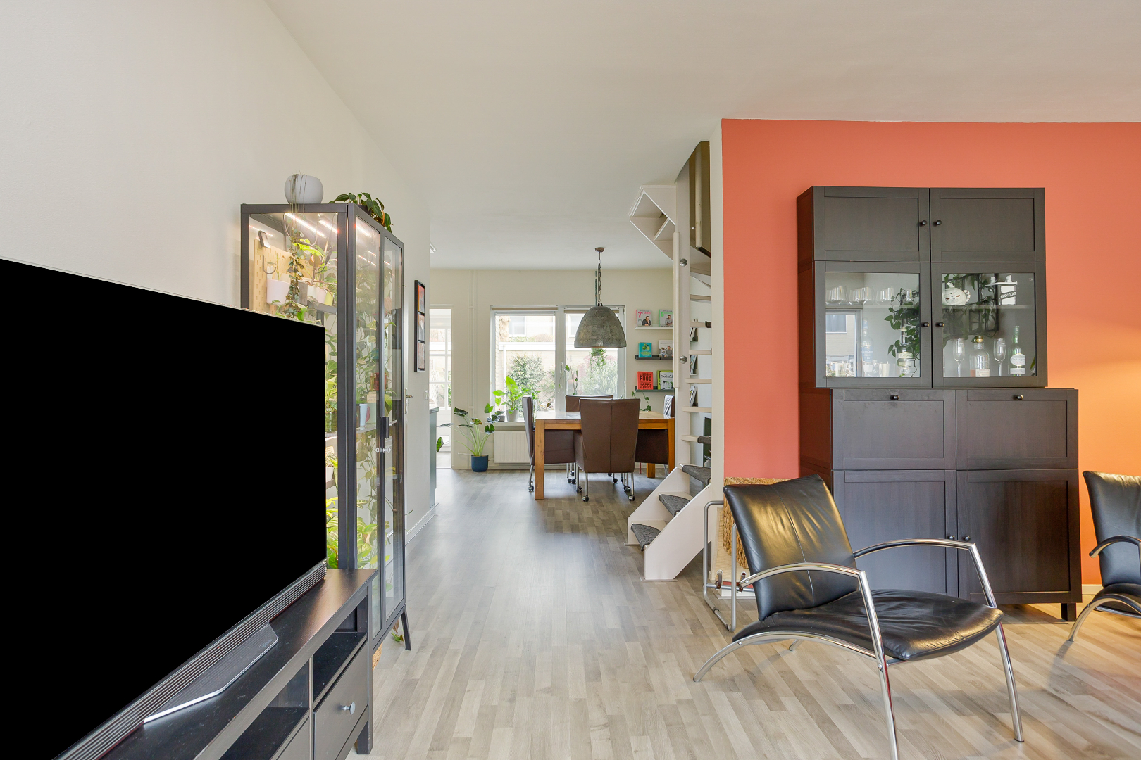 Ruime Z-vormige woonkamer welke via de bijkeuken toegang heeft naar de tuin, grote raampartijen die zorgen voor veel lichtinval,. De woonkamer is afgewerkt met een lichte laminaat vloer en stucwerk wanden en -plafond.