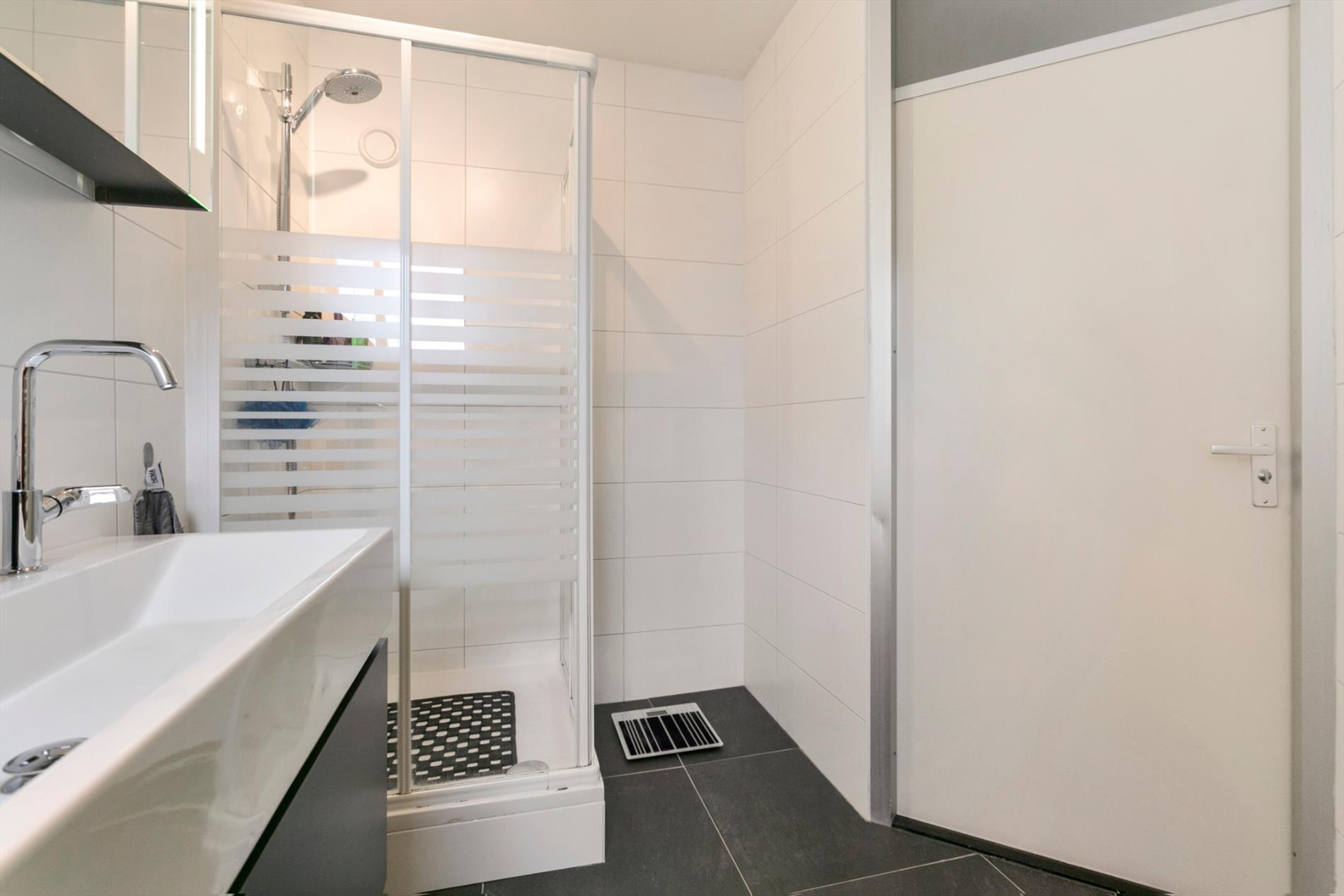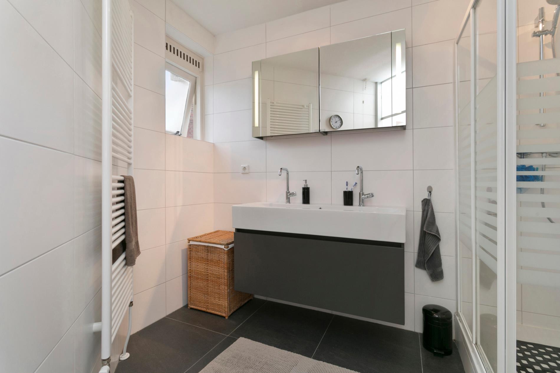 Ruime en geheel betegelde badkamer voorzien van douchecabine, dubbele wastafel met meubel en spiegelkast en designradiator. Het betreft een luxe geheel dat modern en in neutrale kleuren is afgewerkt.