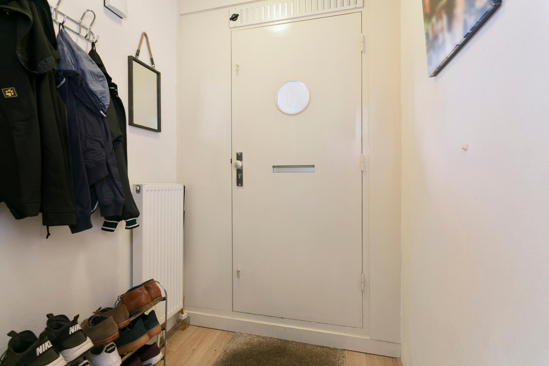 Entree naar hal met garderobe en een laminaatvloer die in het hele appartement aangebracht is m.u.v. badkamer en toilet.