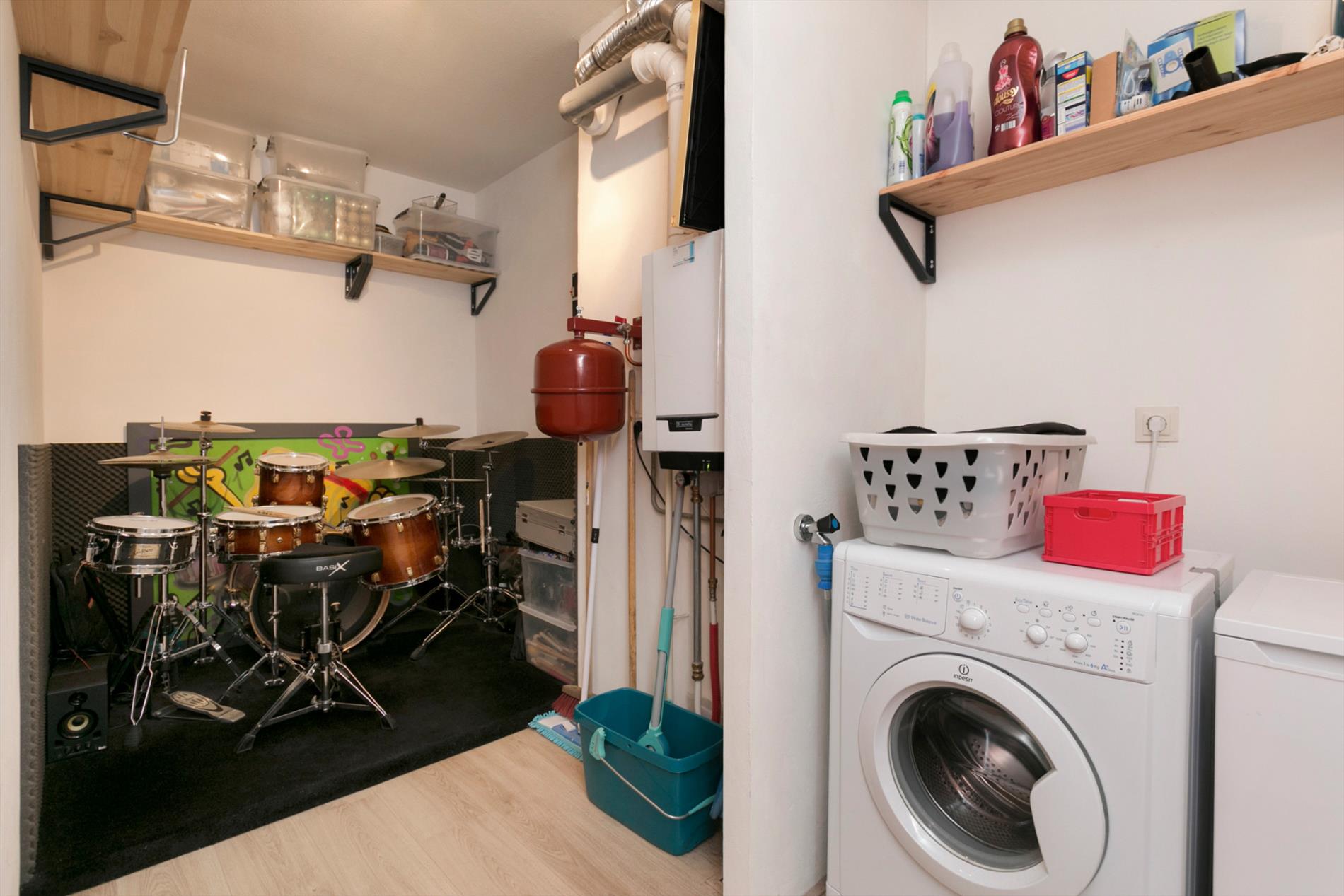 Vanuit de woonkamer is de ruime inpandige berging te bereiken met opstelling van combi cv-ketel (HR, december 2012) en opstelling wasmachine en droger. De groepenkast is hier aanwezig en meer dan voldoende bergruimte.