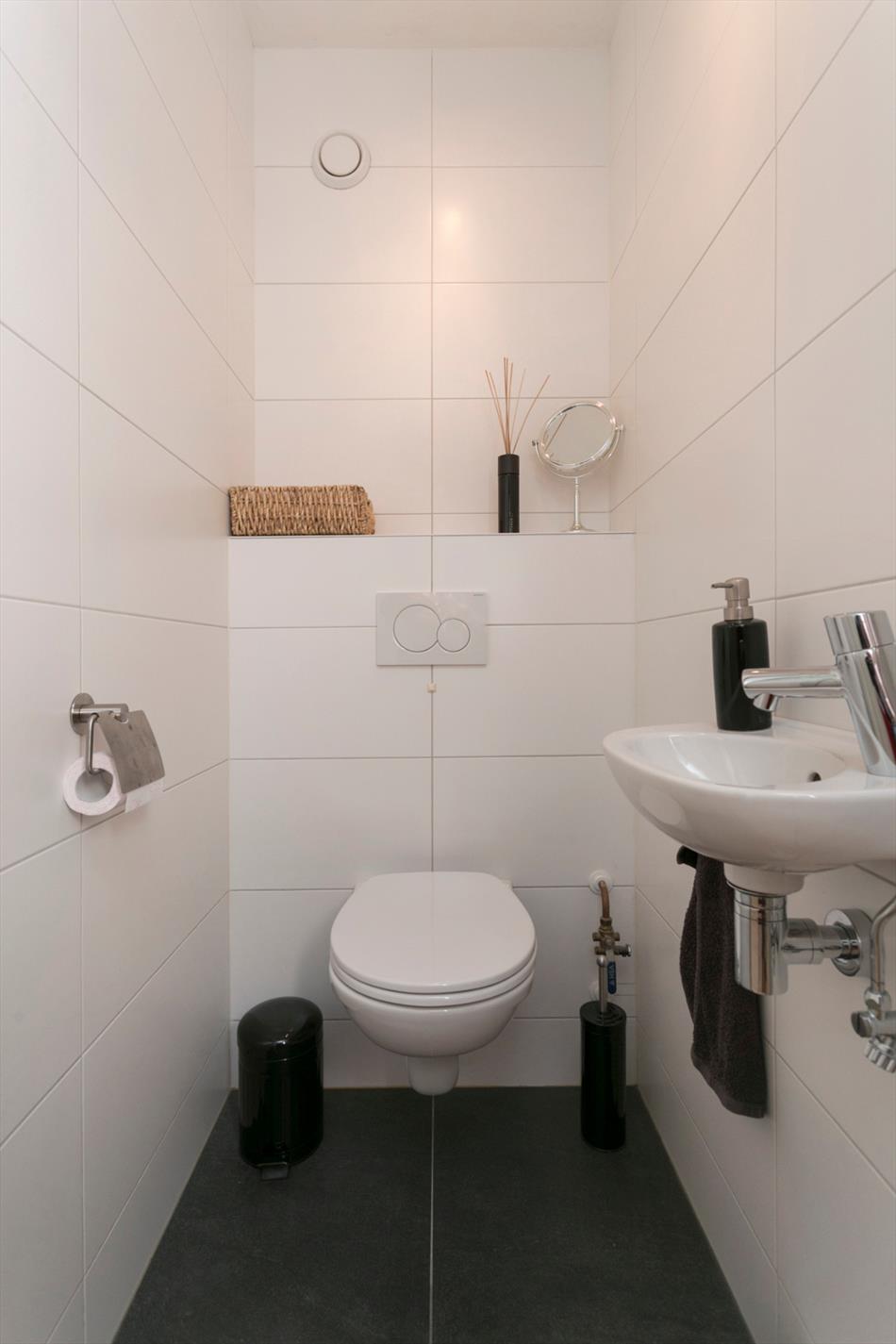 Geheel betegelde toiletruimte met zwevend toilet en fonteintje.